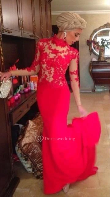 Red High Neck Mermaid Evening Dresses Long Sleeves Appliques Prom Dresses