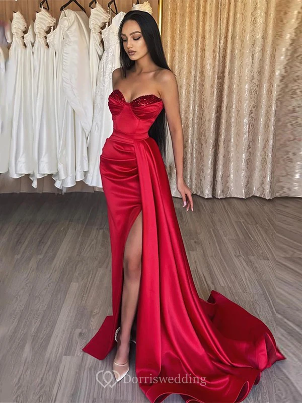 Red Satin Front Split Sheath Sweetheart Prom Dress with Sweep Train