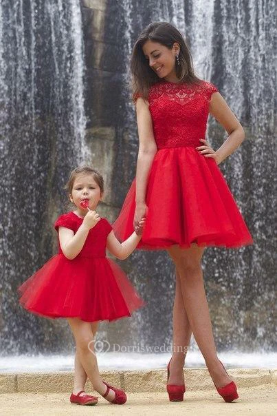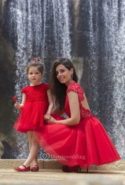 Red Scoop Cap Lace Empire Tulle A-line Short Flowergirl Dress