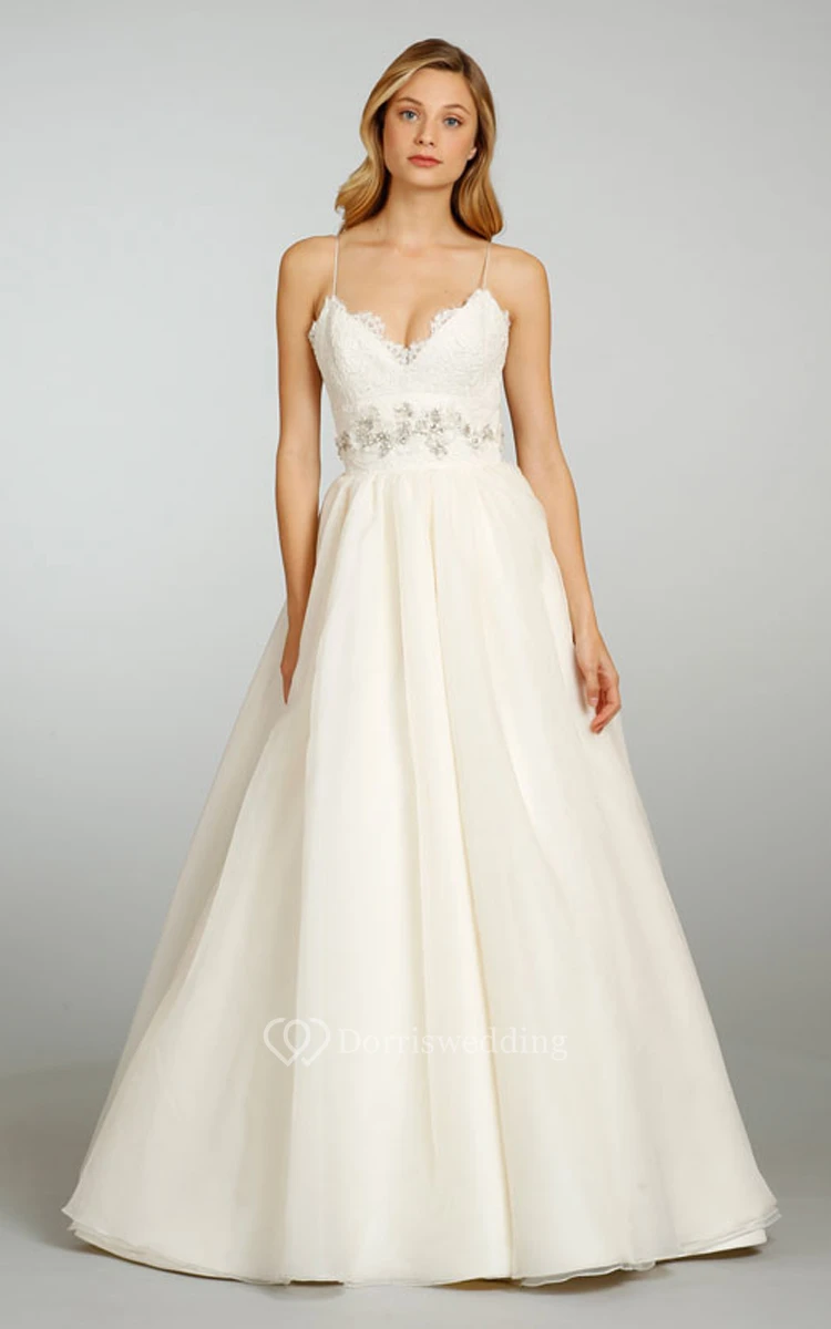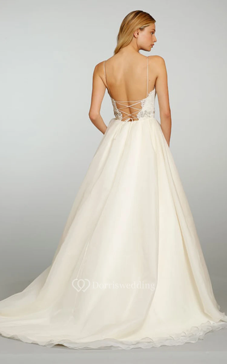 Refined Spaghetti Strap Lace Bodice Organza Ball Gown With Lace Up Back