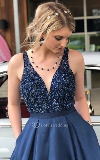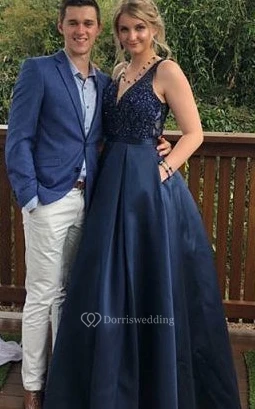 Romantic A Line Satin Floor-length Sleeveless Evening Dress with Pockets