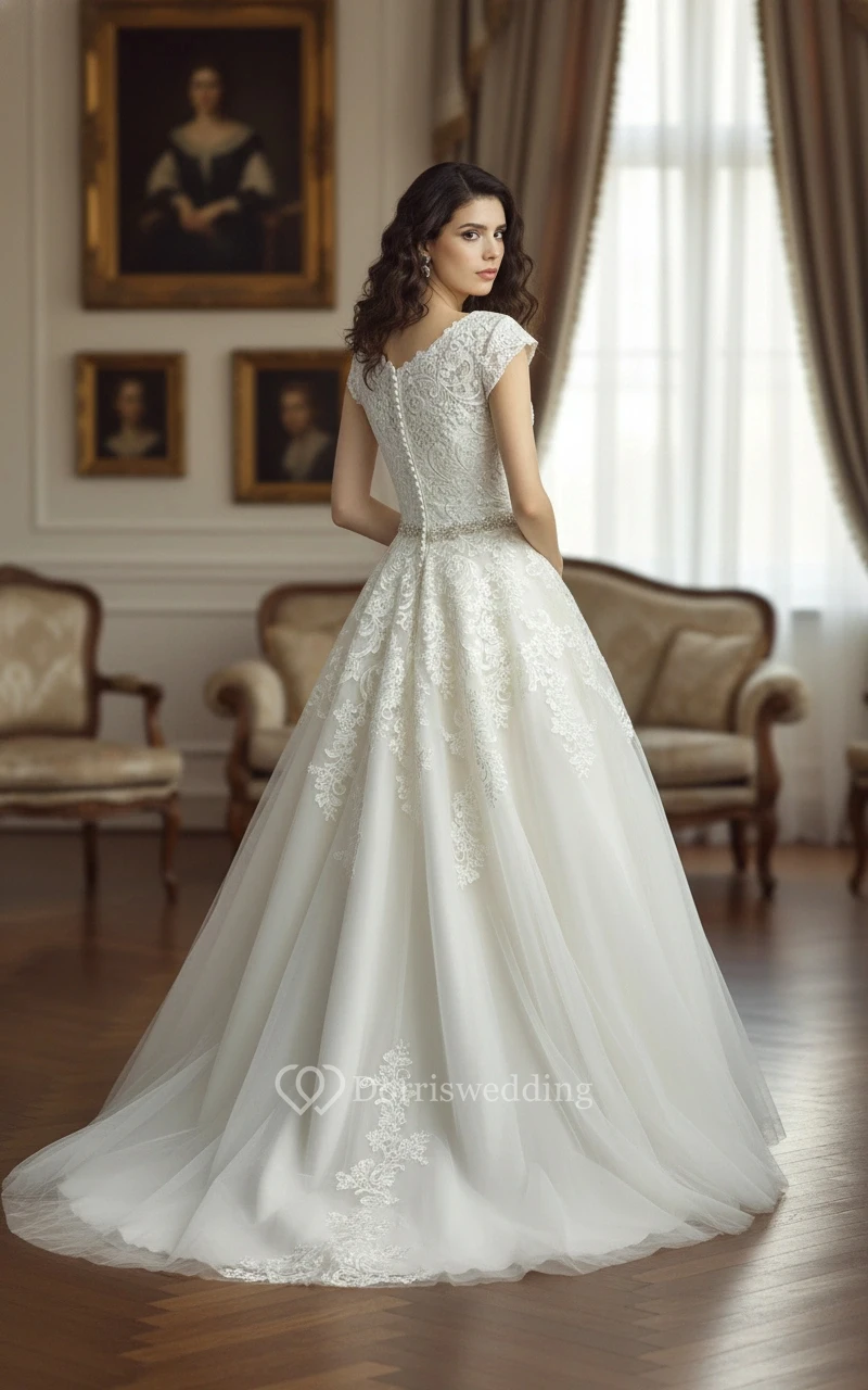 I wore this for my fairytale wedding and it was perfect. The cap sleeves and ball gown shape were exactly what I wanted.
