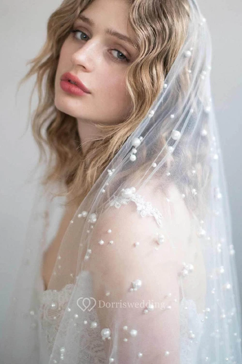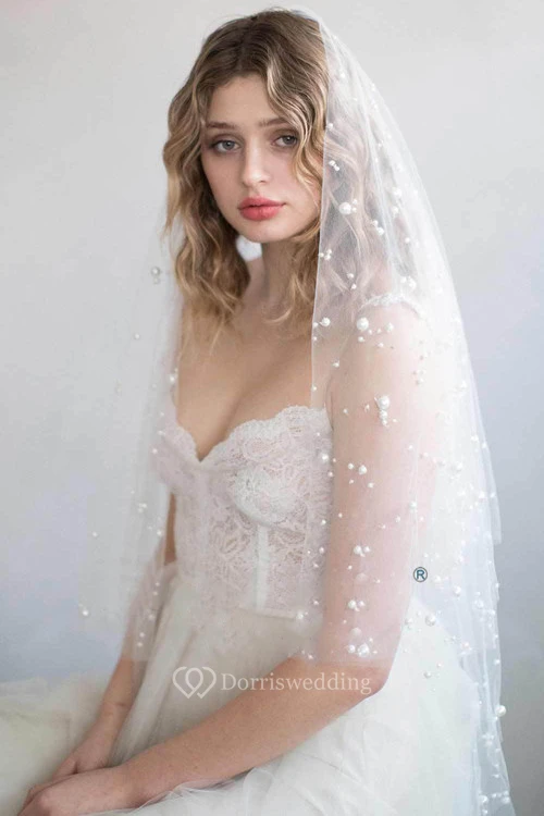 Romantic Fingertip Tulle Wedding Veil with Pearls