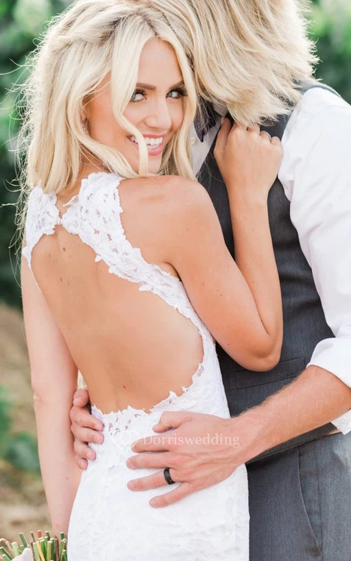 Romantic High Neck Lace Sheath Floor-length Sweep Train Sleeveless Wedding Dress