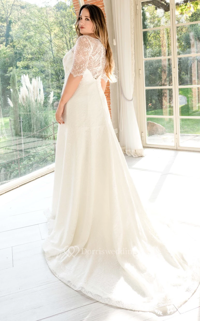 • Hemline/Train: Floor-length, Sweep/Brush Train
