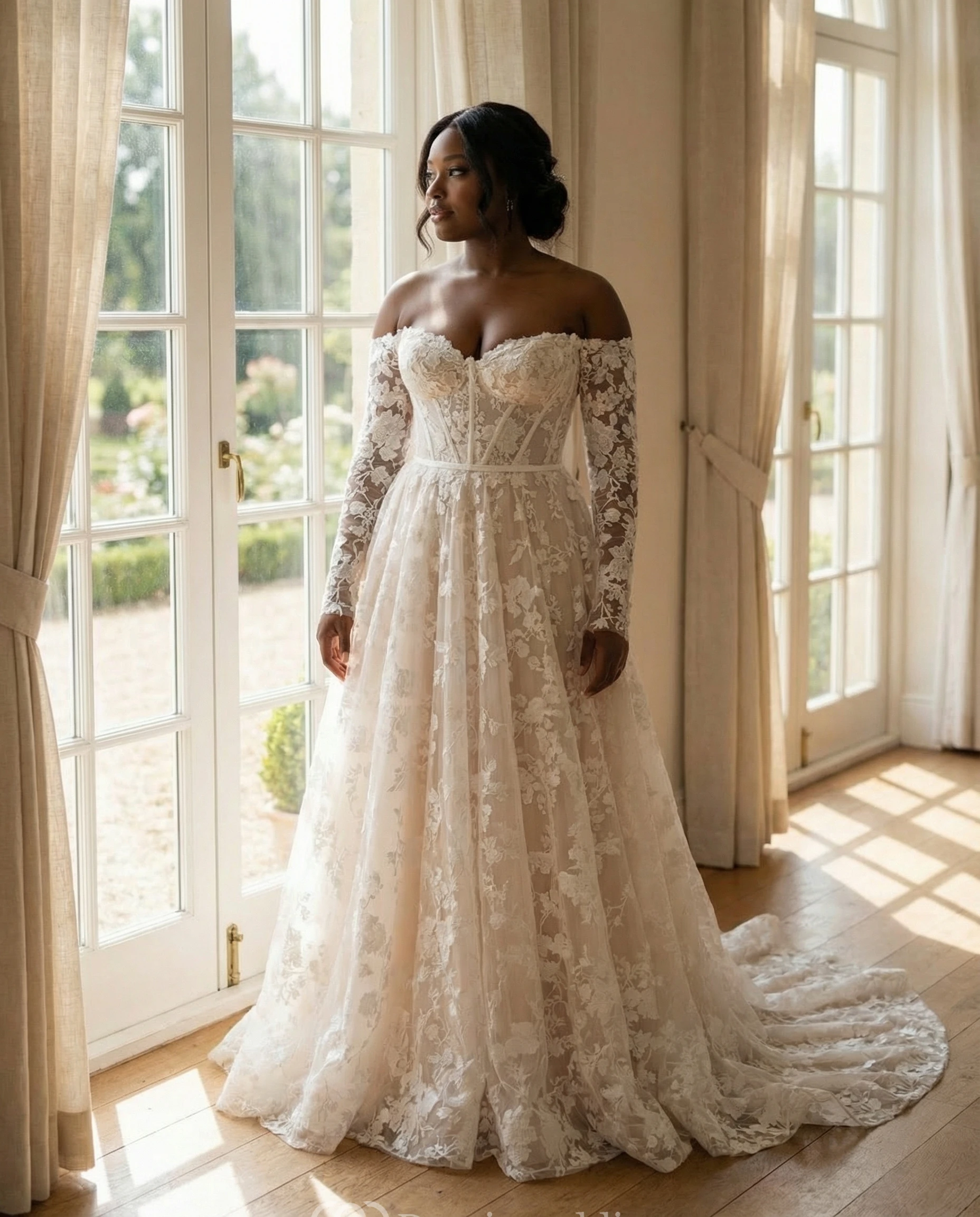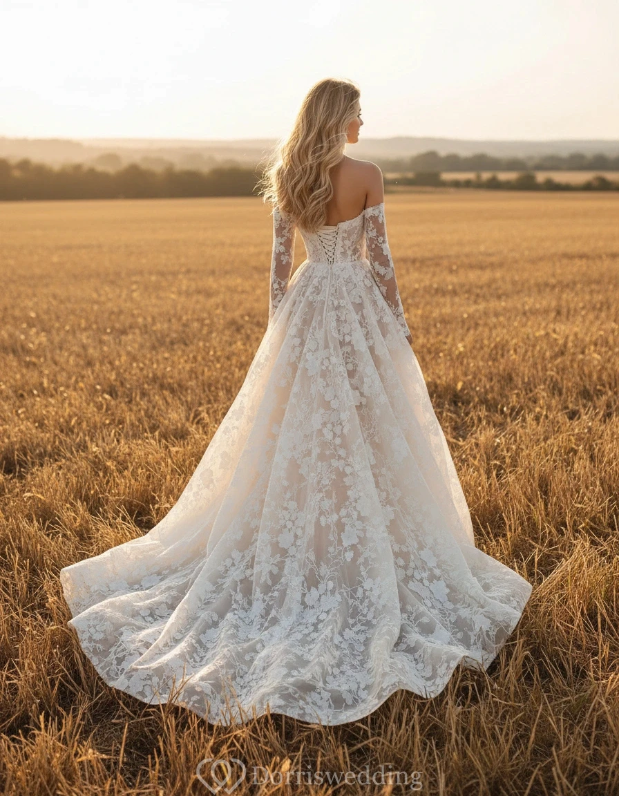 I cannot stop looking at my photos in this dress! The way the floral lace overlays the tulle is just magical. The off-the-shoulder sleeves add such a soft, ethereal touch. I did have to get it steamed because it's a lot of fabric, but it was worth it. The corset fits like a dream and gave me the perfect hourglass figure. I highly recommend it for any romantic bride.