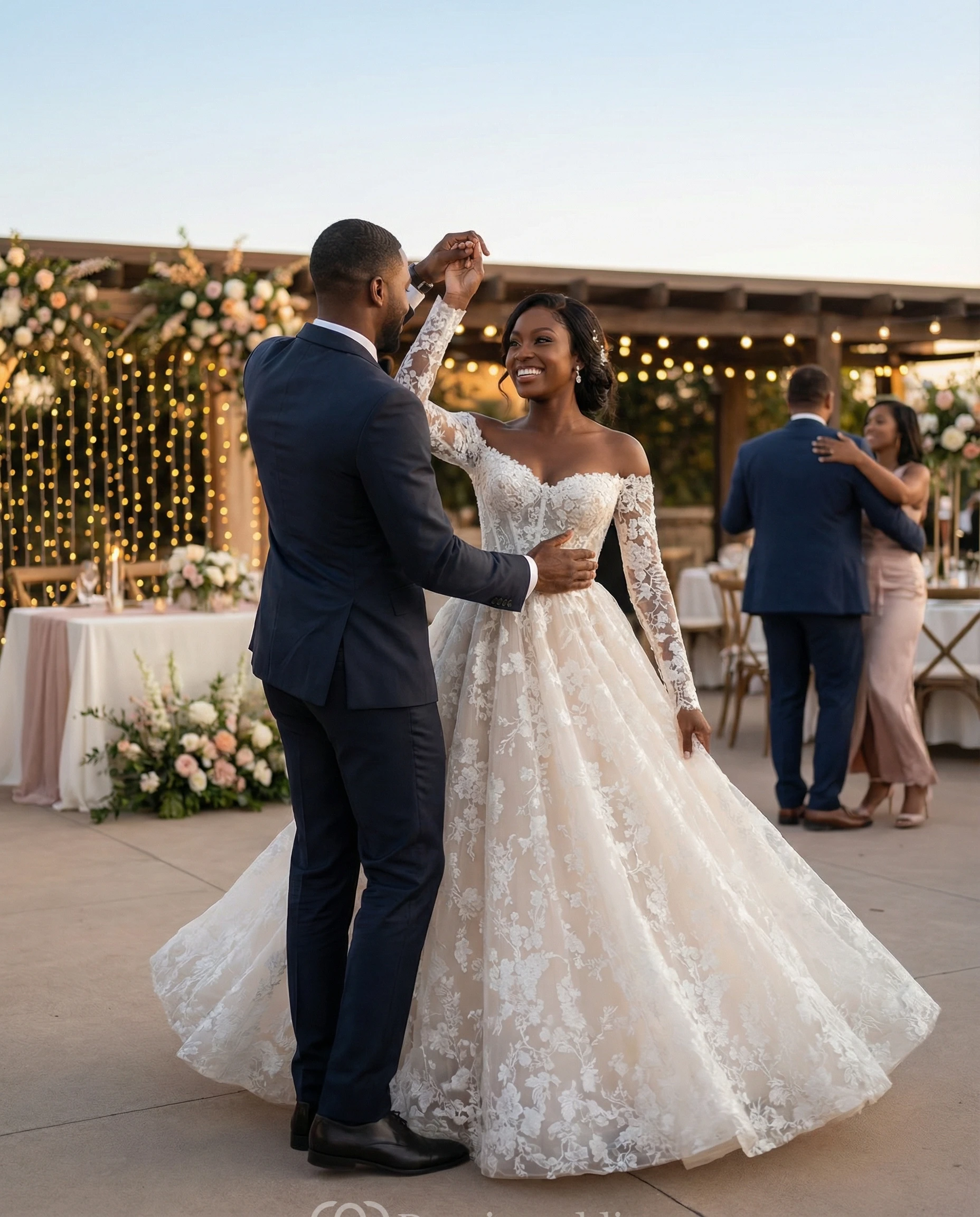 I wore this for my garden wedding and it was perfect. The floral lace tied in so well with the surroundings. The off-the-shoulder sleeves stayed up all day without any issues.