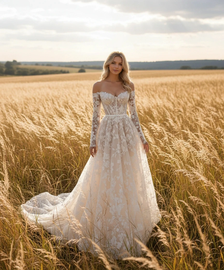 I was looking for a dress with a corset and floral details, and this was the perfect match. The lace is soft and high quality, and the floral appliqués are stunning. The off-the-shoulder sleeves are very pretty and the A-line shape is so classic. It’s a very well-made dress that feels very special. I am so happy I chose this for my big day—it was absolutely perfect.