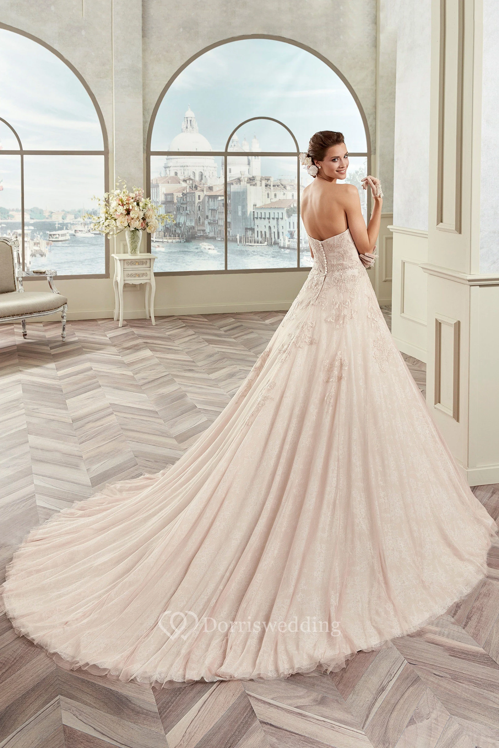 Romantic Strapless A-Line Bridal Gown With Floral Waist And Fine Appliques