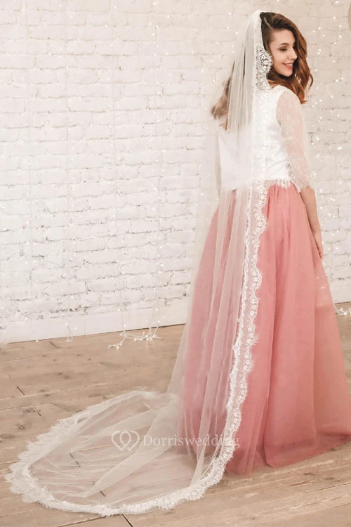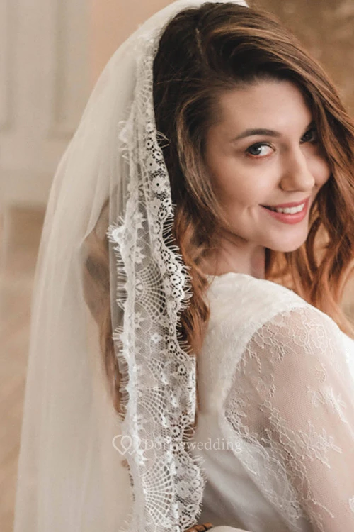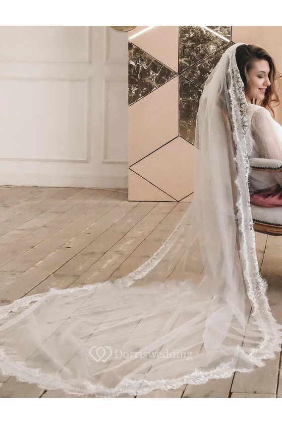 Romantic Style Long Tulle Wedding Veil with Lace Edge