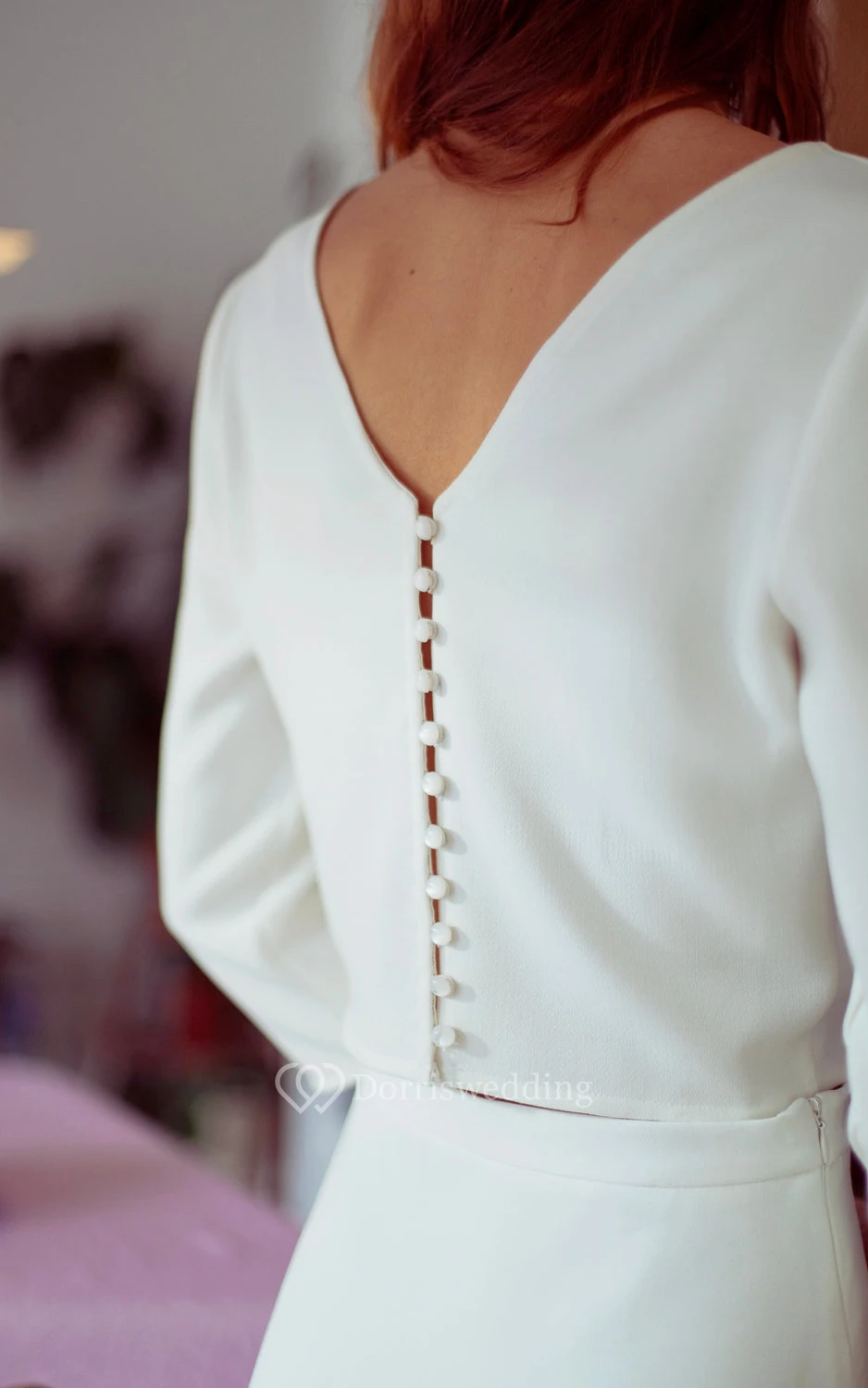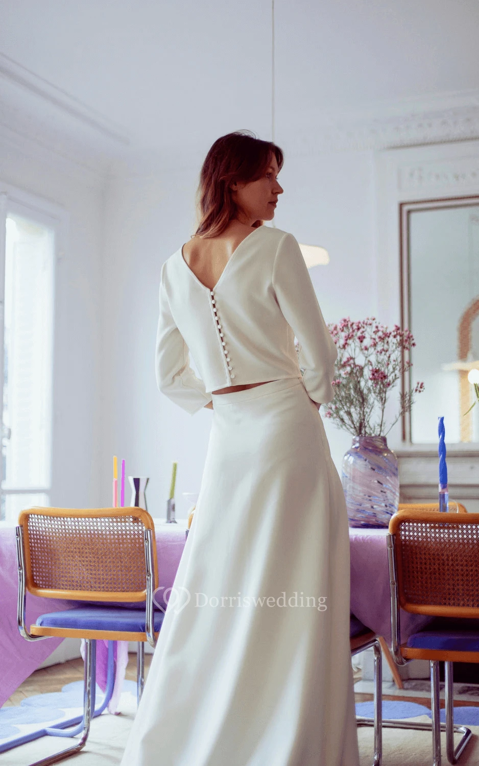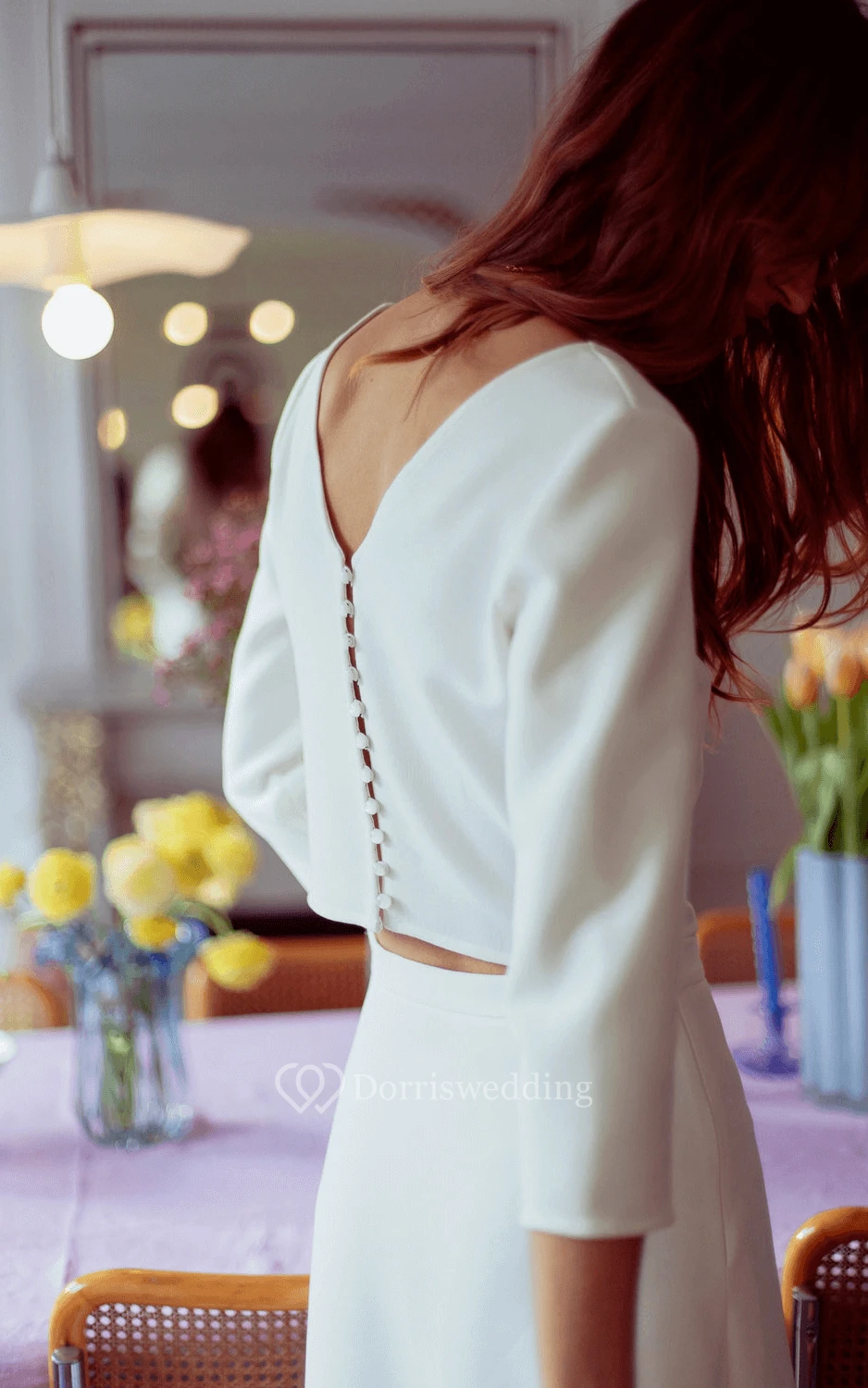 Romantic V-neck 3/4 Sleeve Two Piece Satin Wedding Dress with Buttons