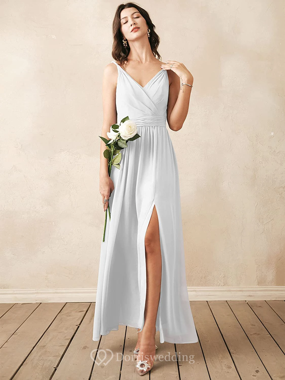 Romantic V-neck A Line Sleeveless Ankle-length Chiffon Bridesmaid Dress With Ruching