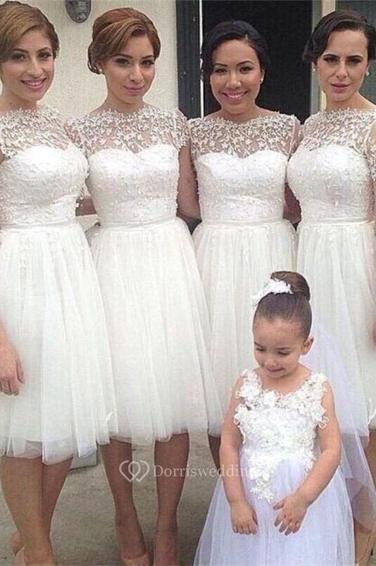 Romantic White Tulle Lace Champagne Bridesmaid Dress Short Sleeve