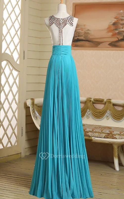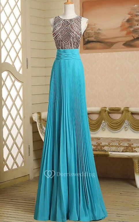 Round Neck A-Line Beading Ruched Long Prom Dress