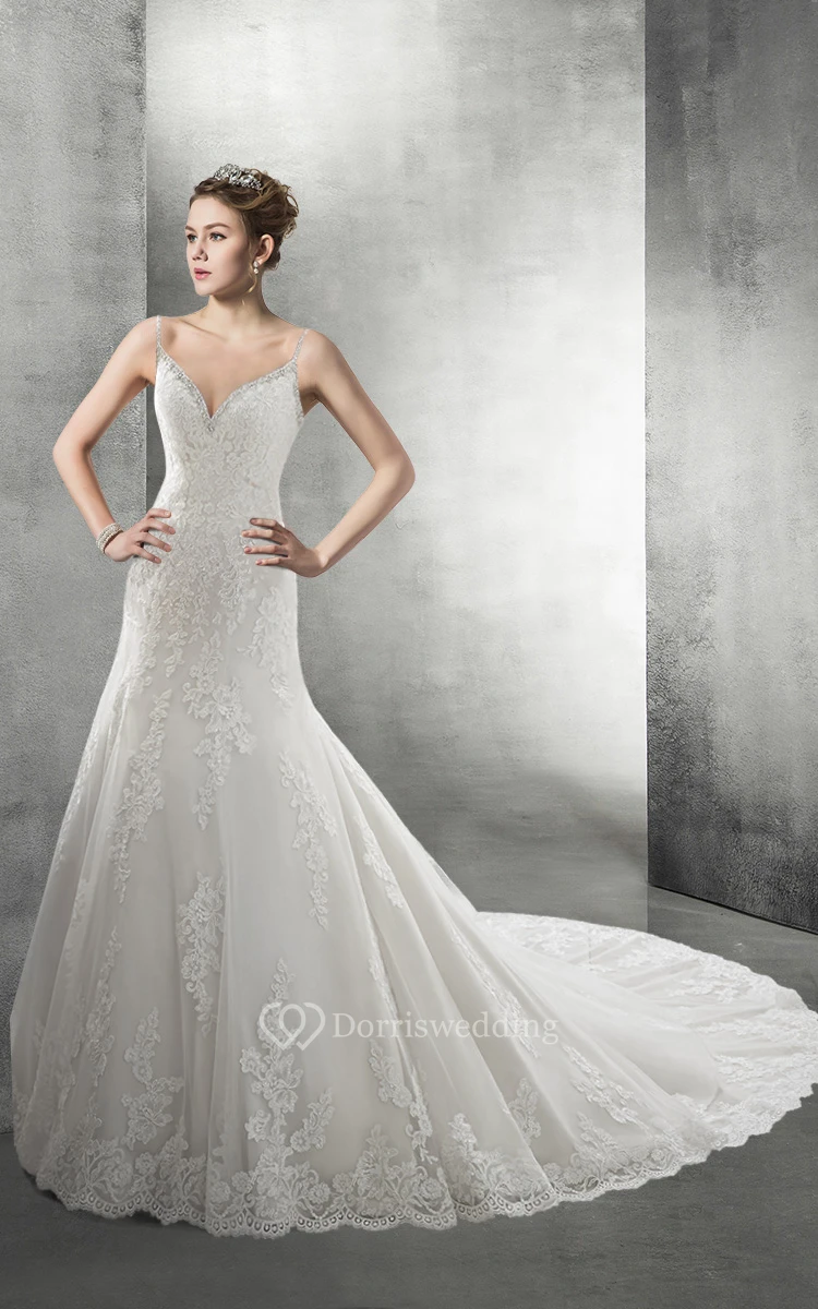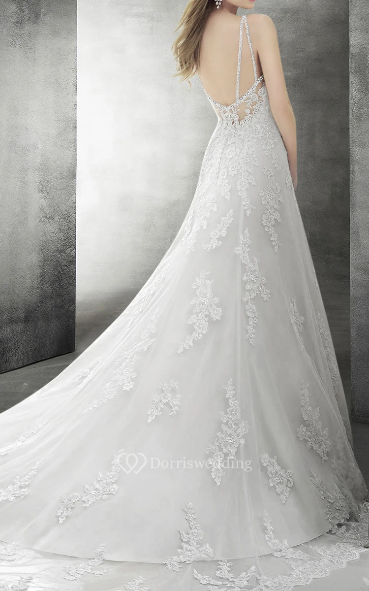 Royal Backless Lace Wedding Dress With Beaded Spaghetti Straps
