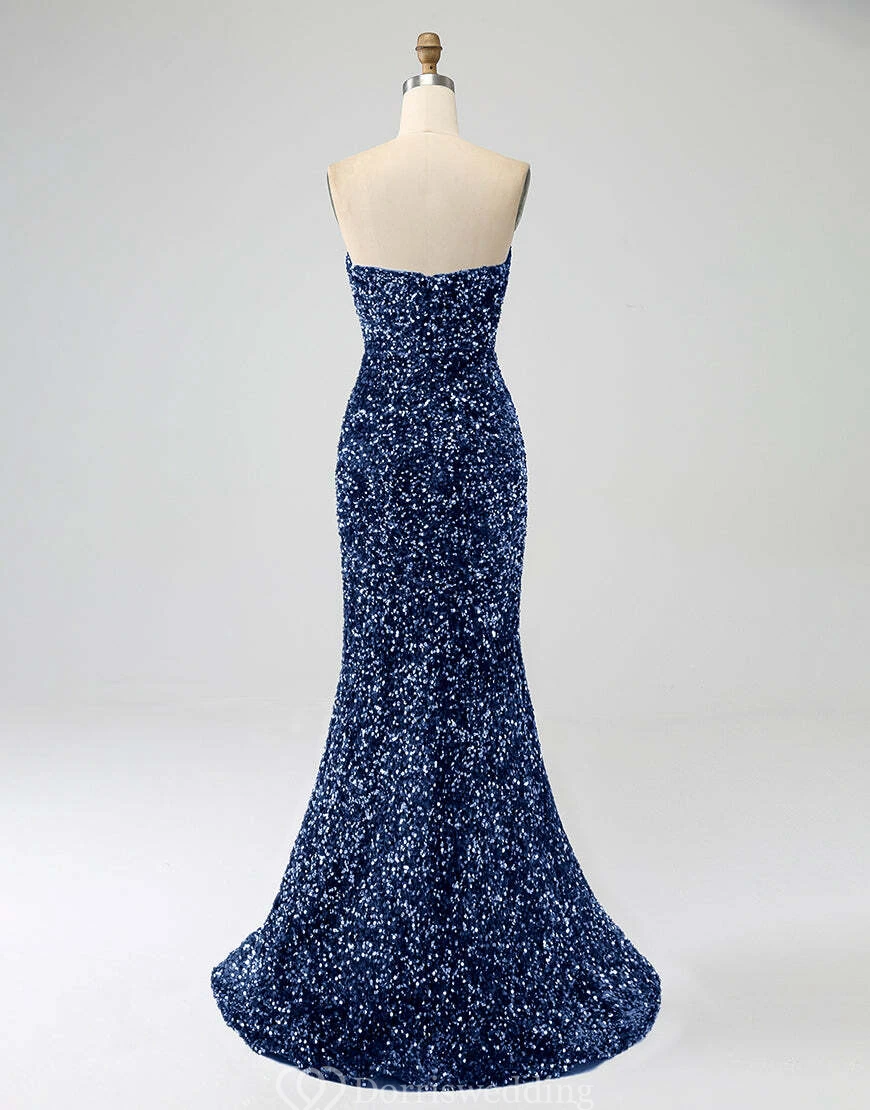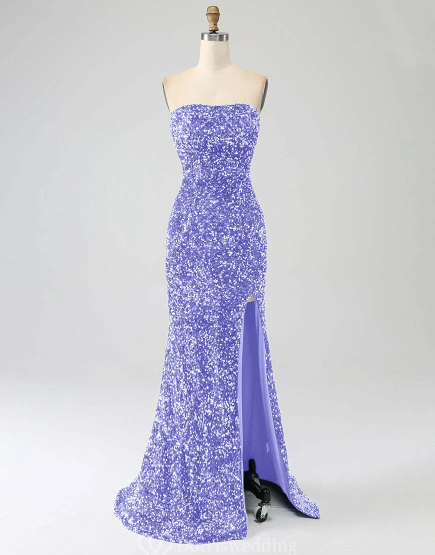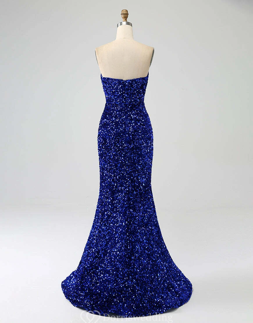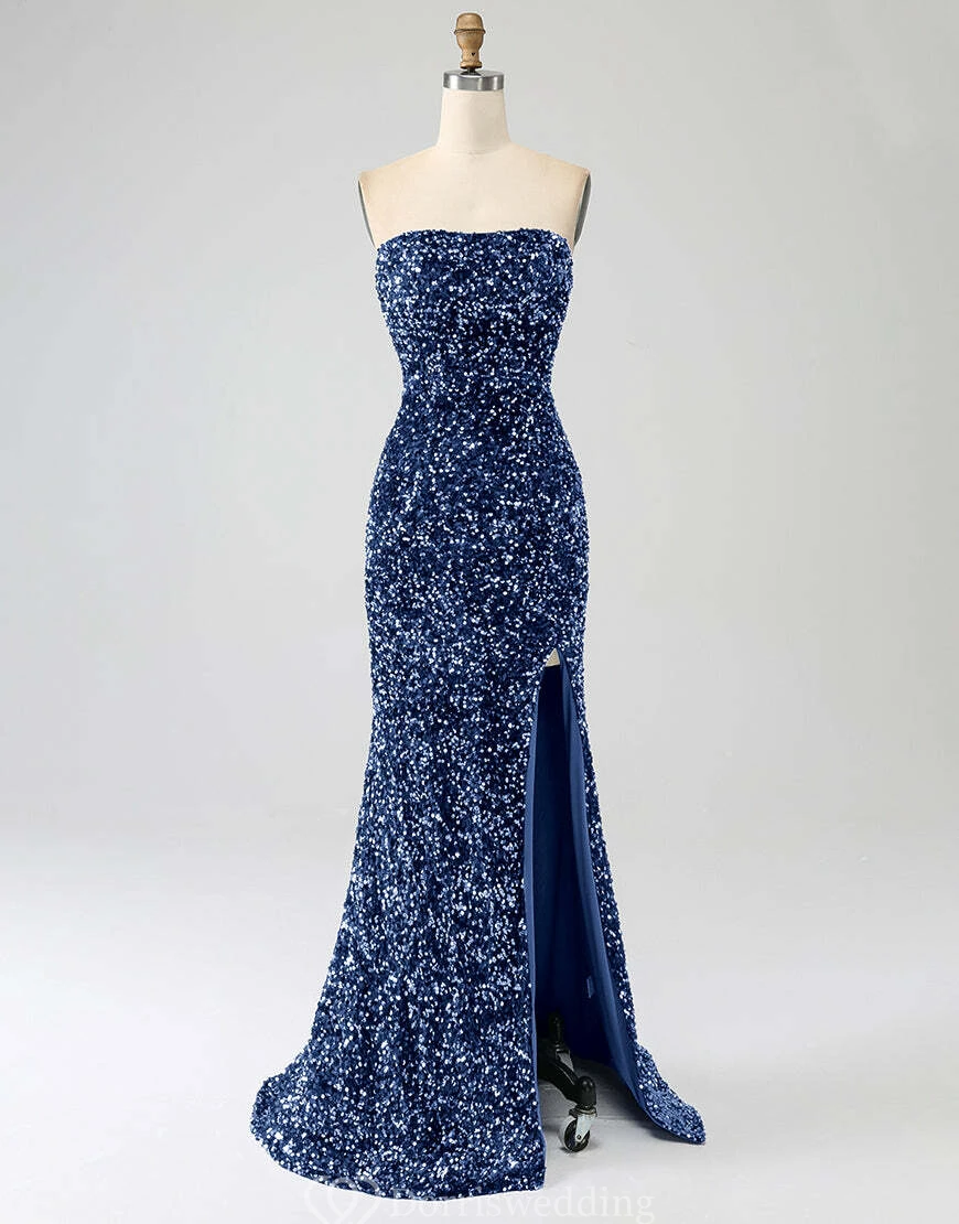 Make a statement in this royal-blue strapless sequin gown, complete with a daring thigh-high slit and fitted silhouette. Ideal for prom, pageants, or any upscale event where you want to shine. ✨ Features: Royal Blue Sequins, Strapless Neckline, Thigh-High Slit, Fitted Silhouette, Floor-Length Hem.