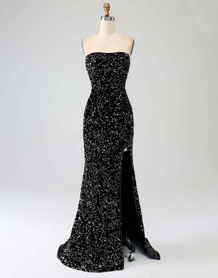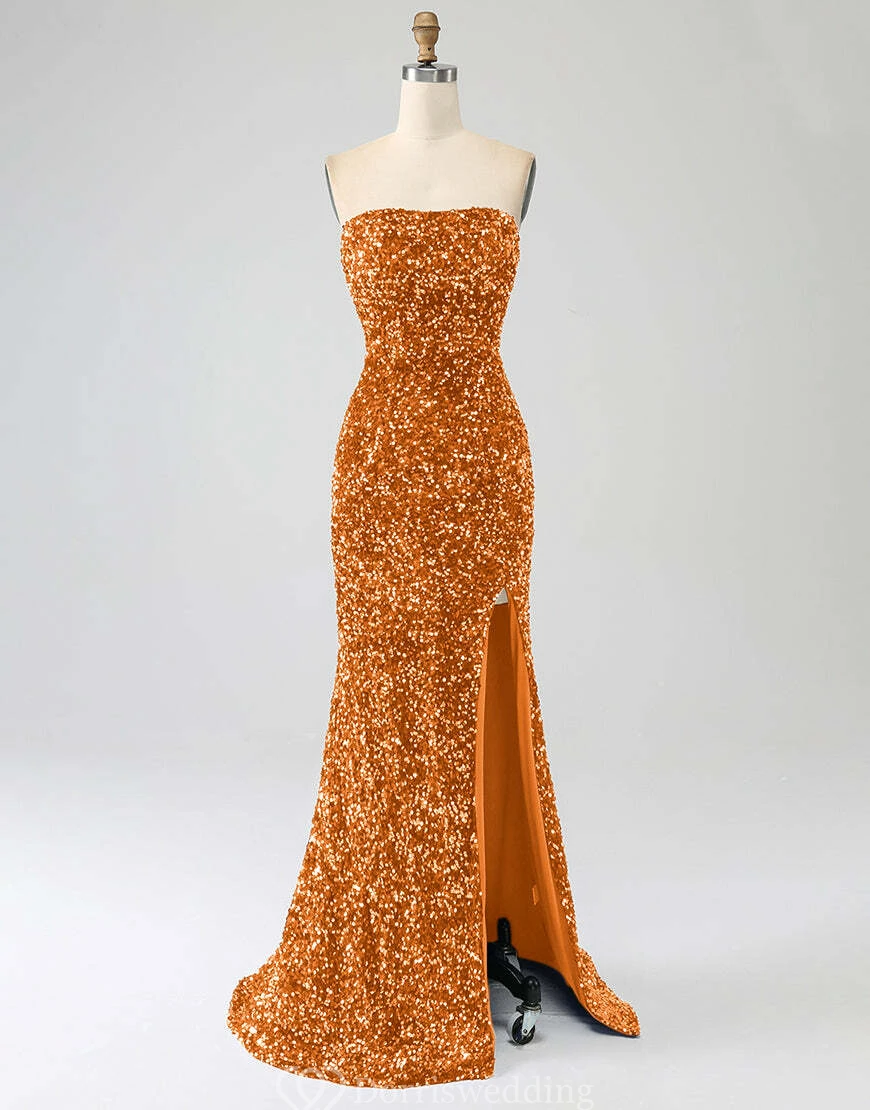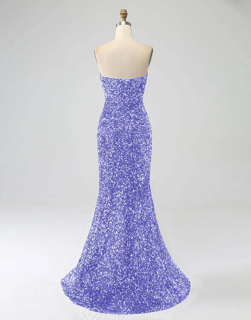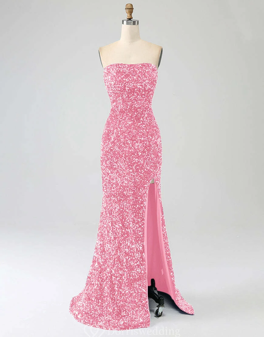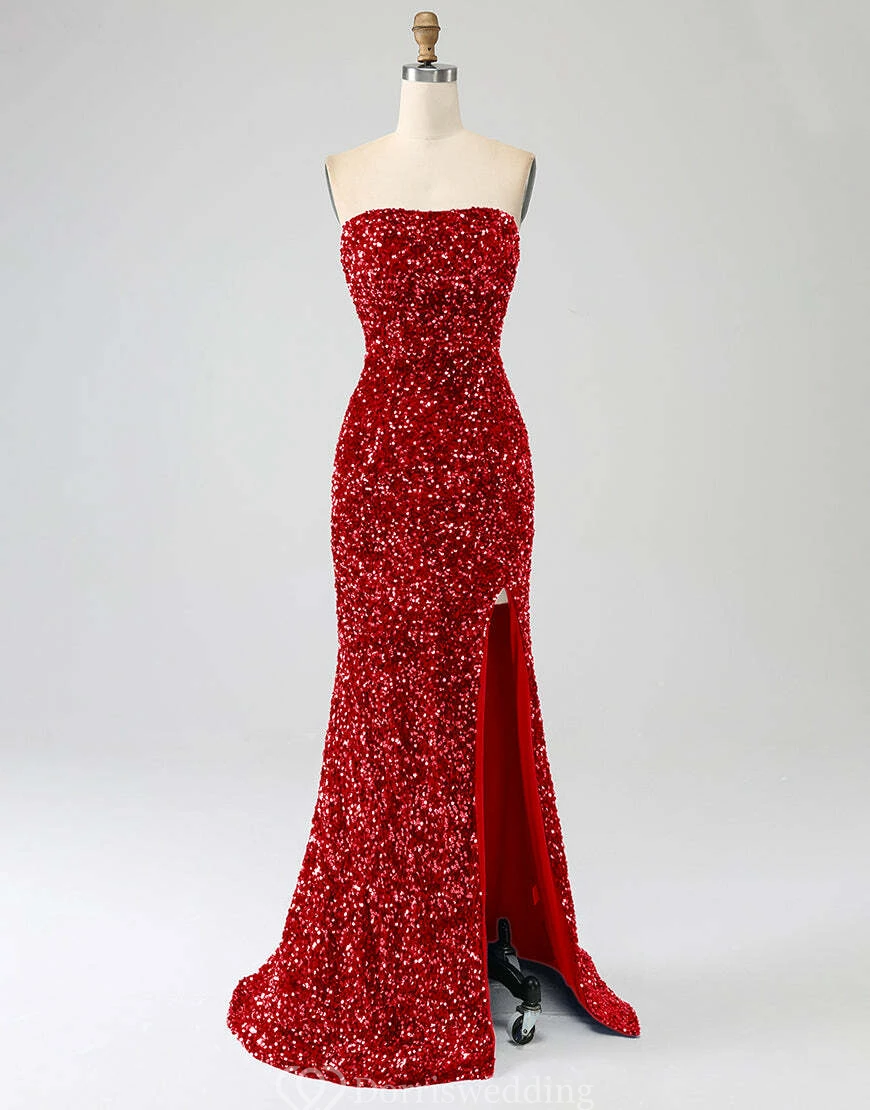 Make a statement in this royal-blue strapless sequin gown, complete with a daring thigh-high slit and fitted silhouette. Ideal for prom, pageants, or any upscale event where you want to shine. ✨ Features: Royal Blue Sequins, Strapless Neckline, Thigh-High Slit, Fitted Silhouette, Floor-Length Hem.