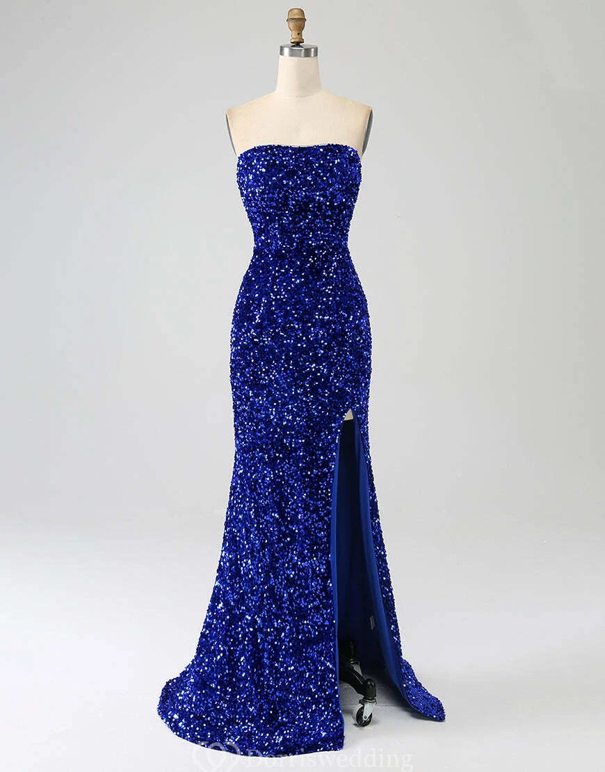 Royal Blue Strapless Sequin Gown with Thigh-High Slit