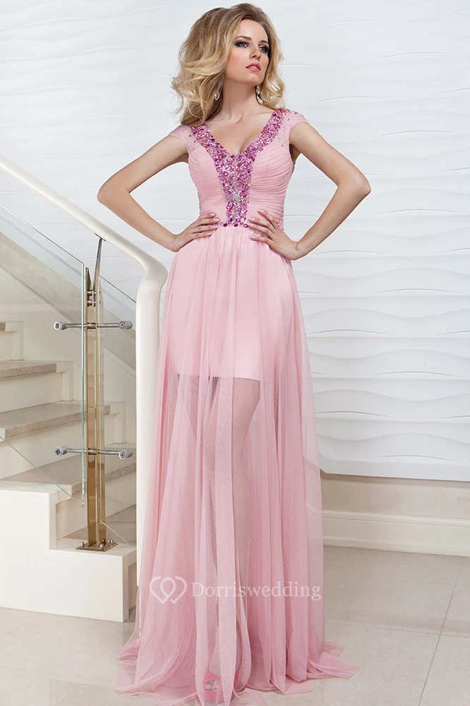 Ruched Cap-Sleeve Maxi V-Neck Tulle Prom Dress With Beading And Pleats