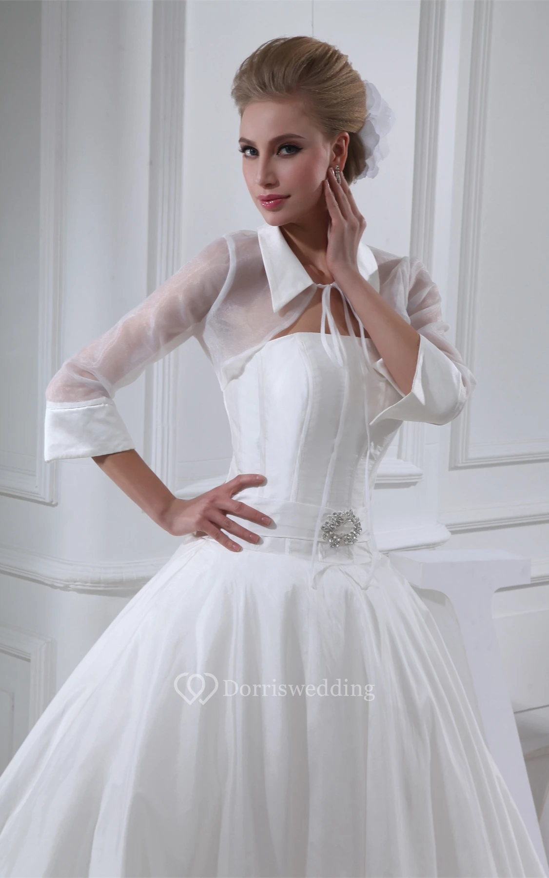 Ruched Collared A-Line Illusion Sleeve and Ball-Gown With Broach