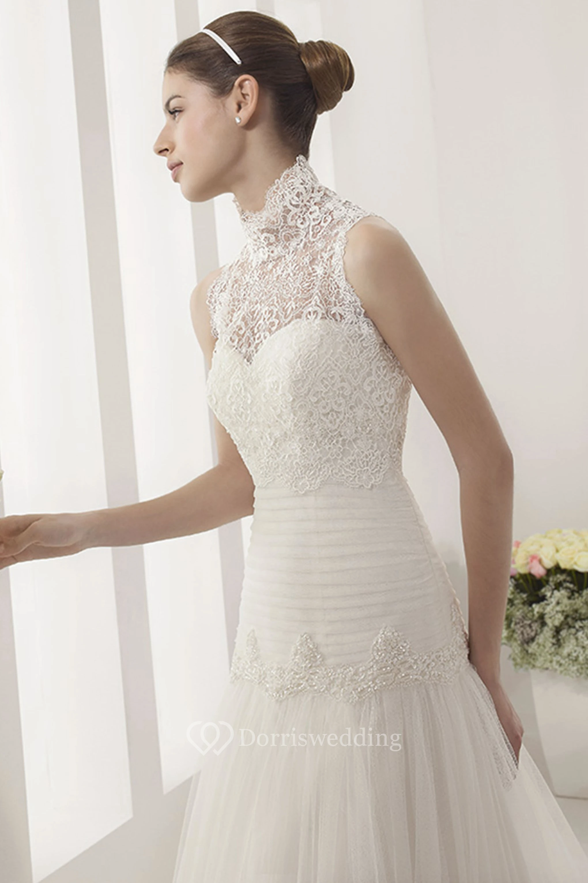 Ruched Drop Waist A-Line Tulle Gown With Removable High-Neck Lace Top