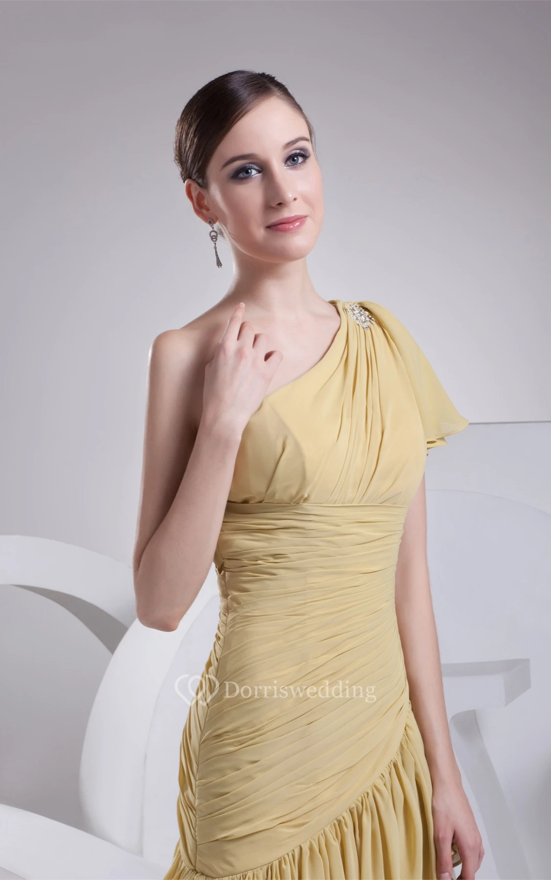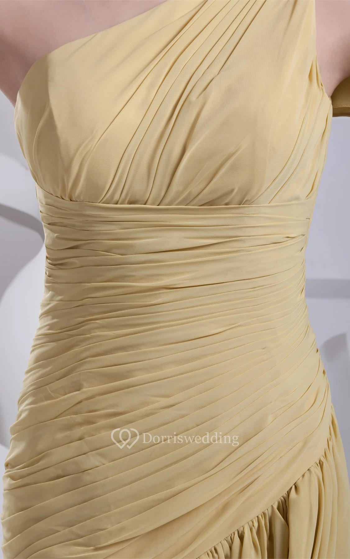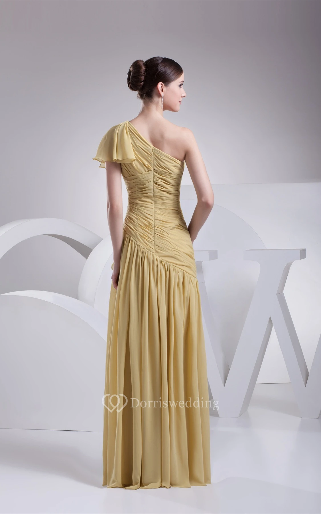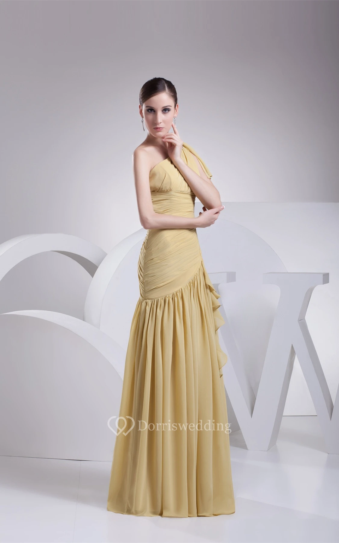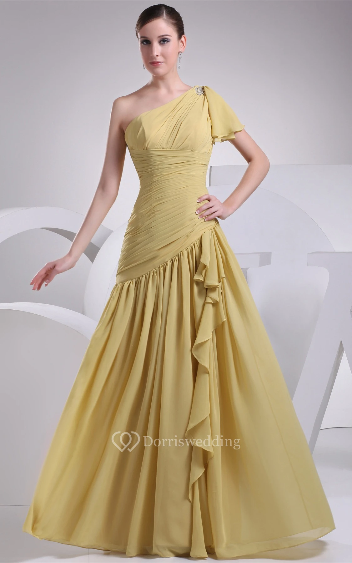 Ruched One Shoulder Sleeveless A-Line Gown With Pleats and Ruffles