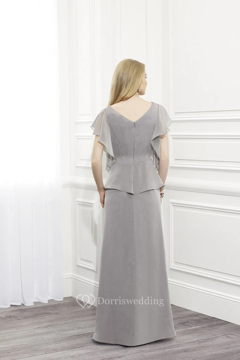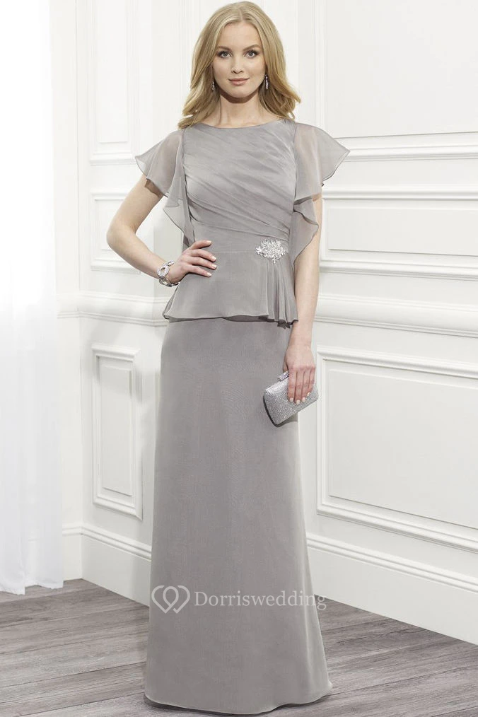 Ruched Poet Sleeve Scoop Neck Chiffon Mother Of The Bride Dress With Broach And Peplum