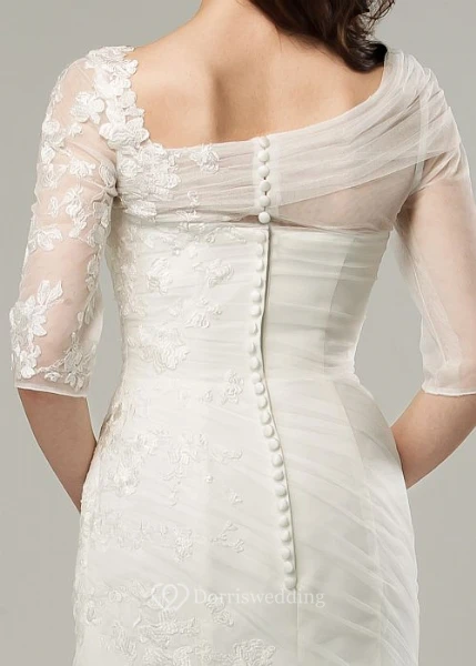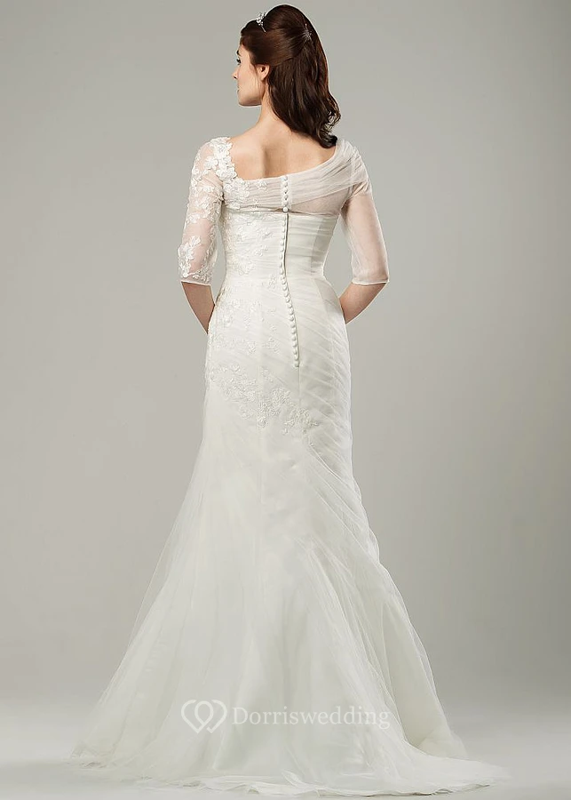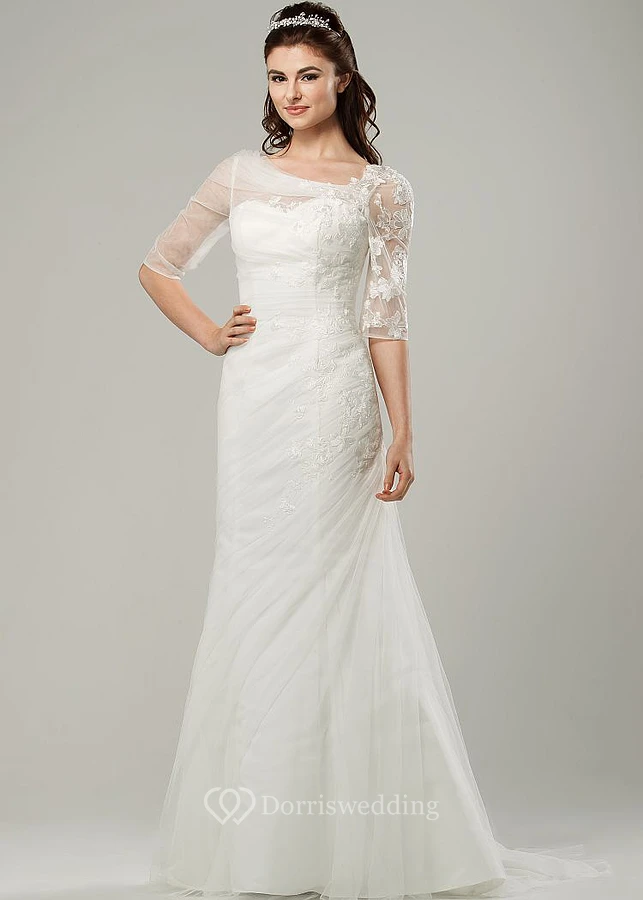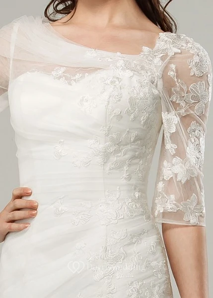 Ruched Scoop-Neck Half-Sleeve Tulle Wedding Dress With Sweep Train