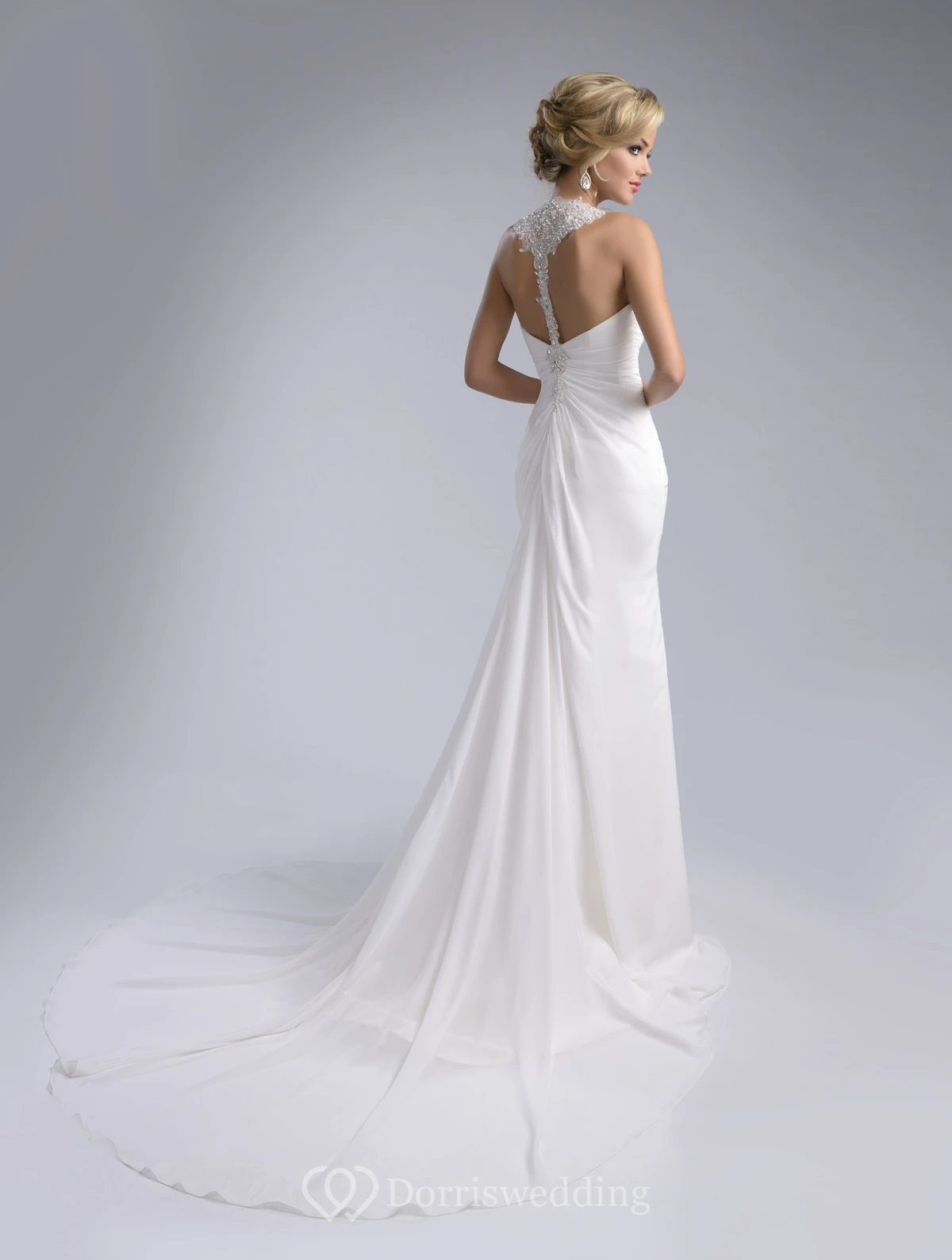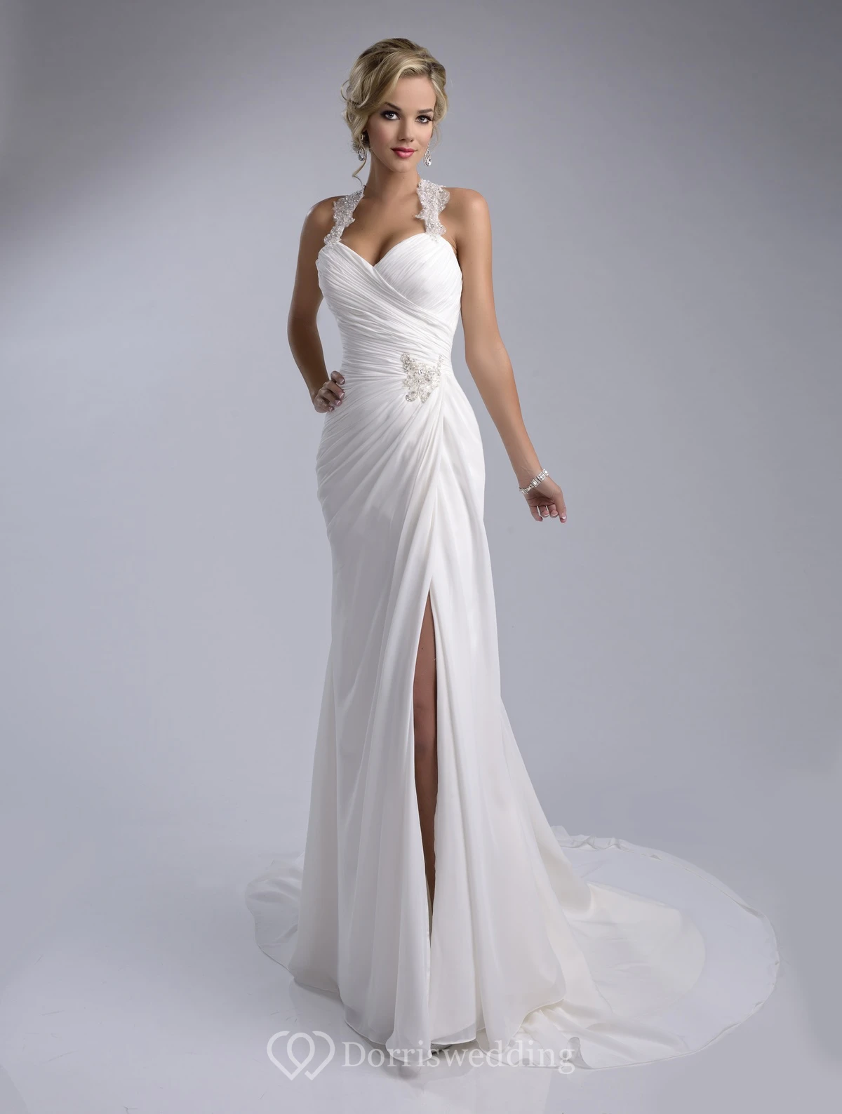 Ruched Sheath Chiffon Beach Wedding Dress Featuring Halter And Side Slit