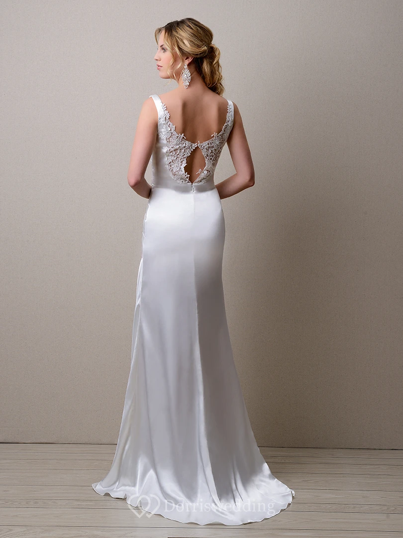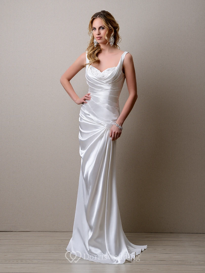 Ruched Sleeveless Sheath Satin Wedding Dress With Lace Embellishment