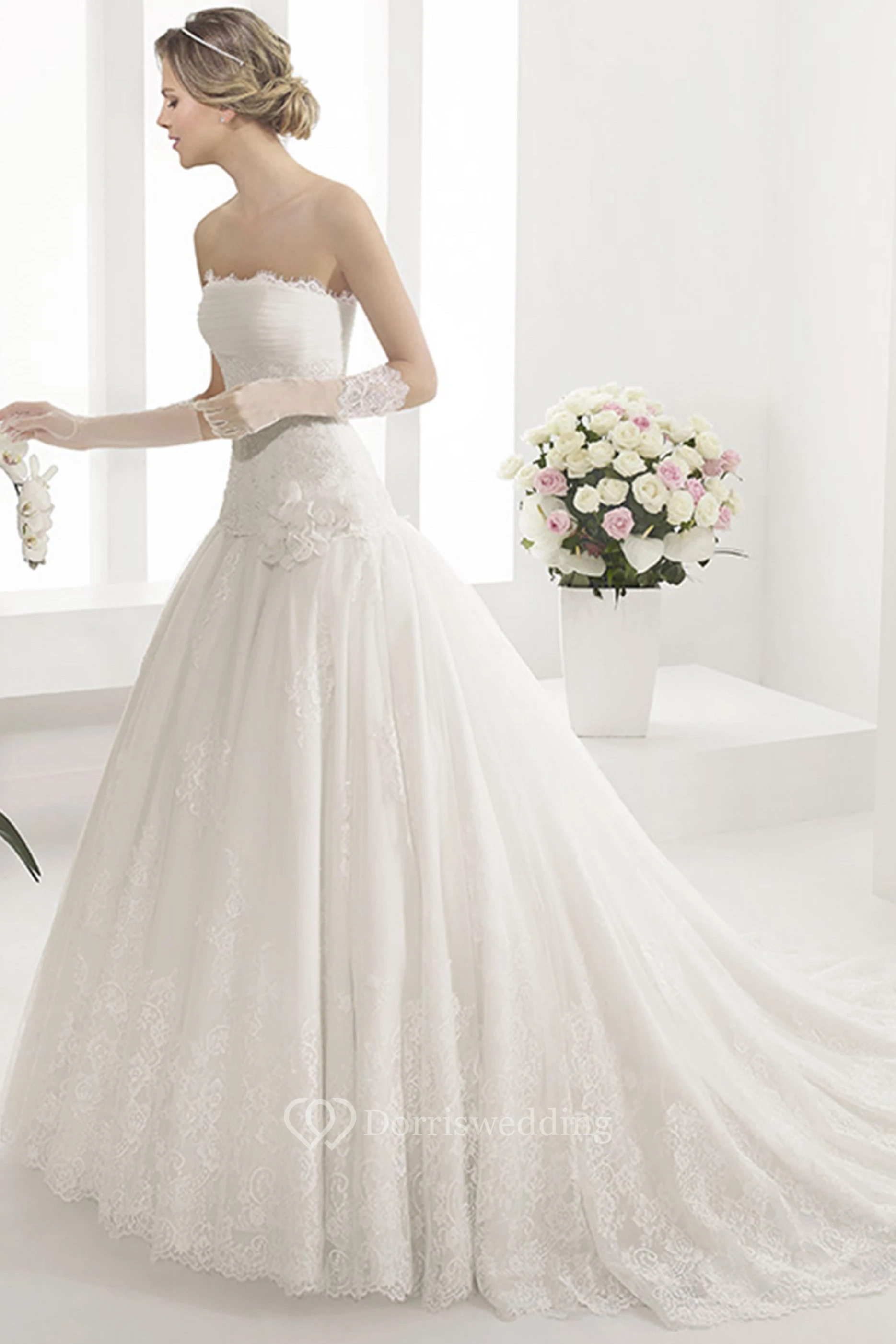 Ruched Top Lace Drop Waist Ball Gown With Organza Flower