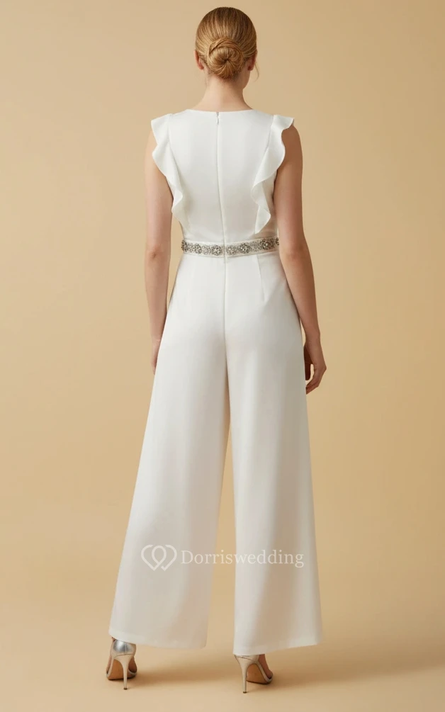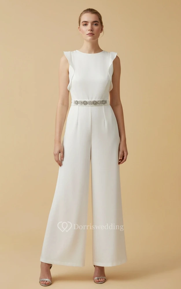 Ruffled Sleeveless Wide Leg Wedding Jumpsuit with Belt