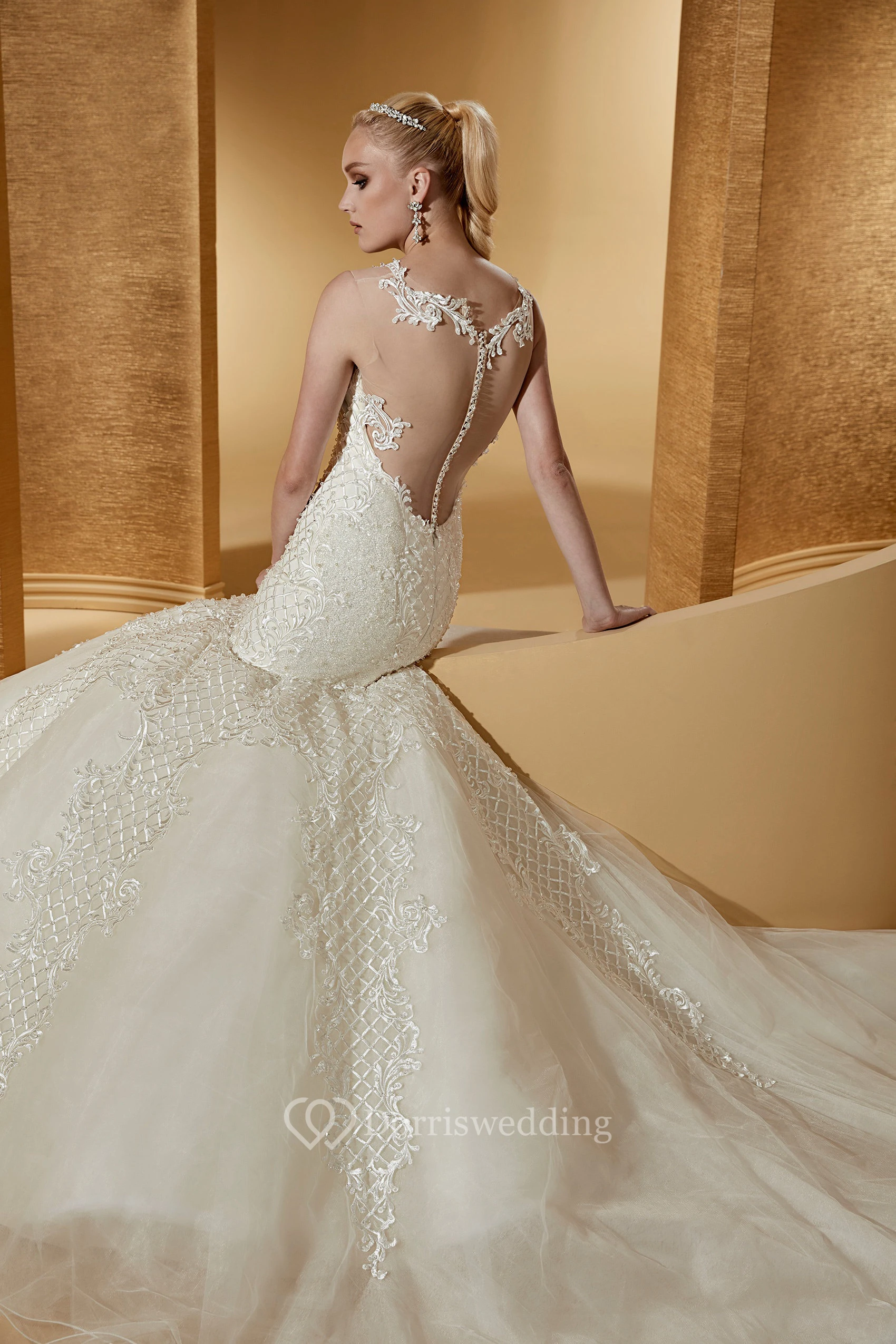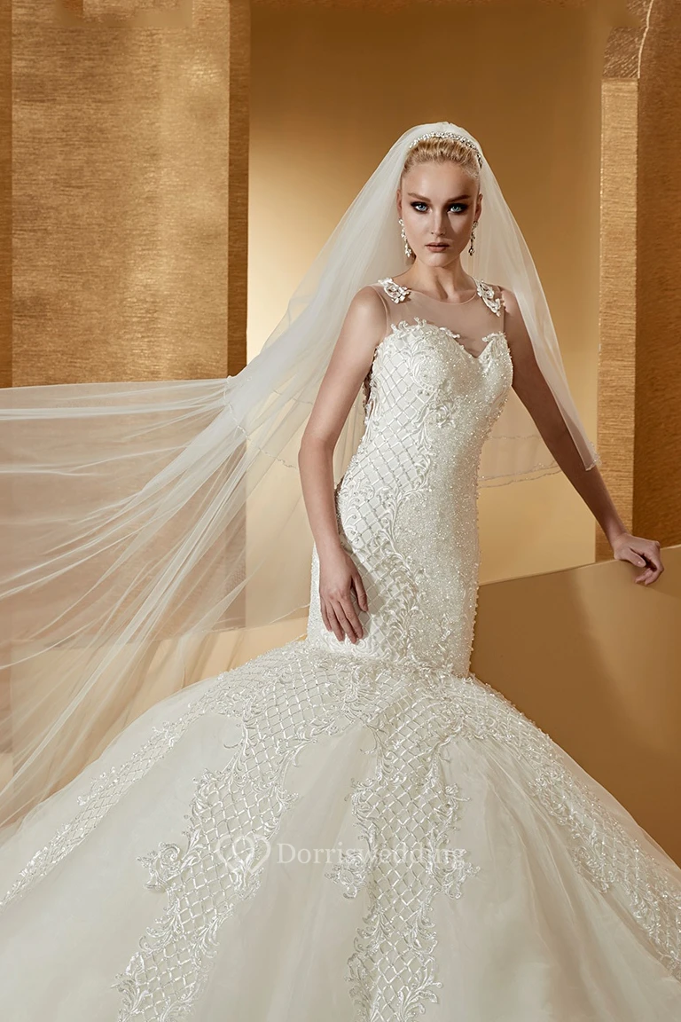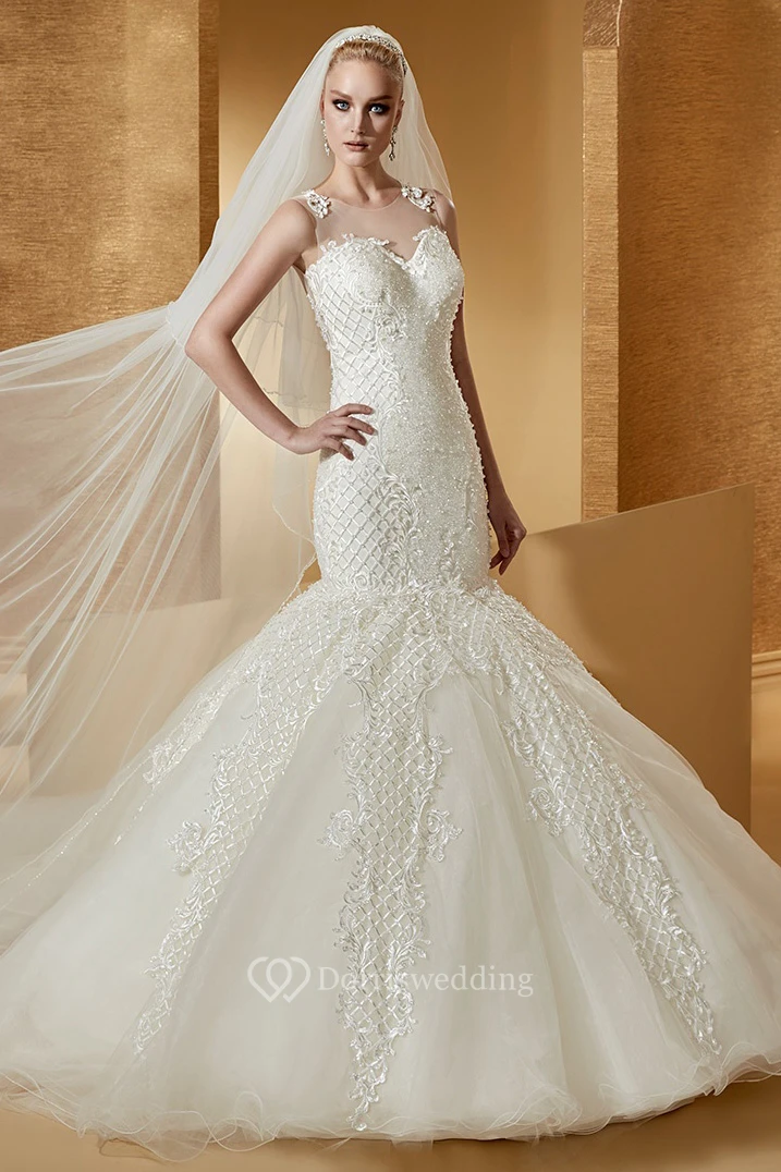 Sassy Cap sleeve Mermaid Wedding Dress with Special Appliques and Illusive Neckline