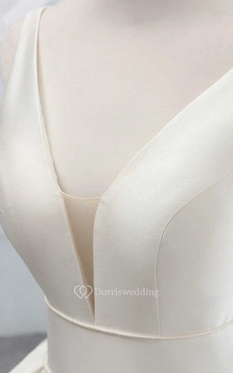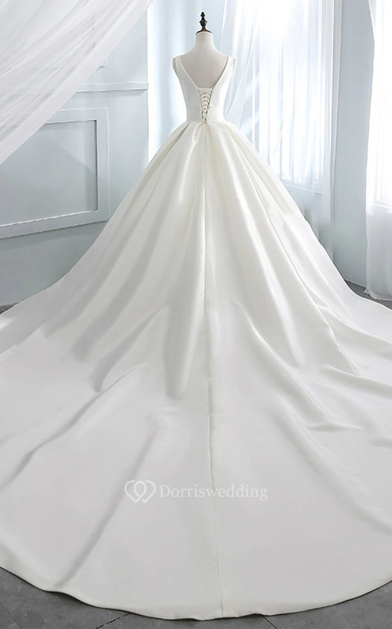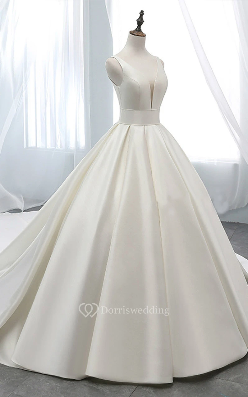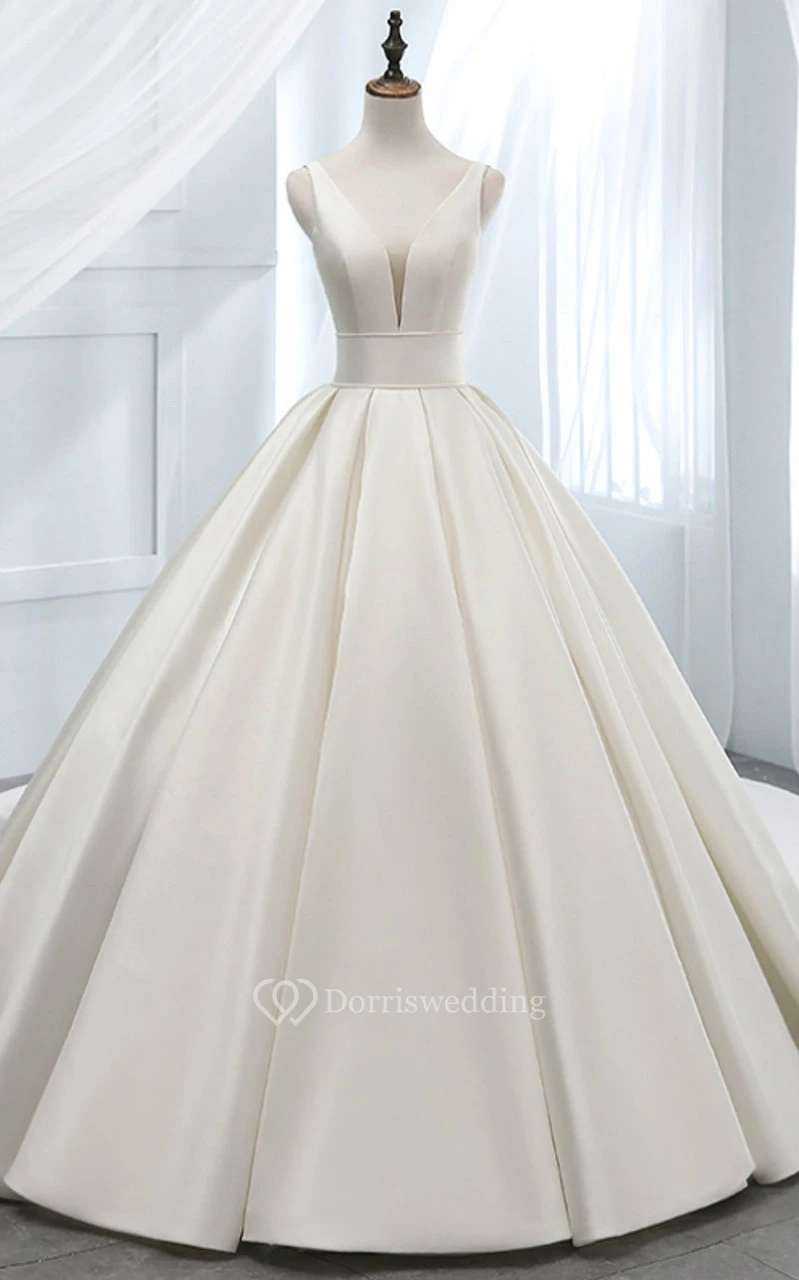 Satin Ball Gown Plunged Sleeveless Solid Elegant Corset Back Princess Wedding Dress Styles
