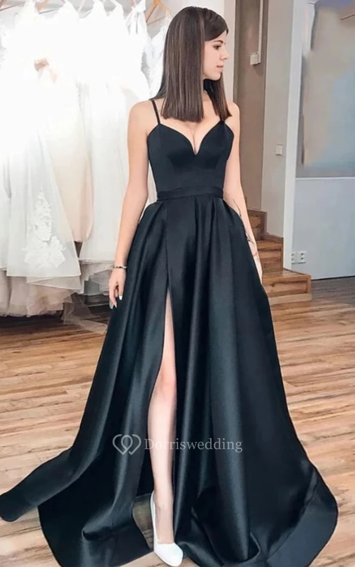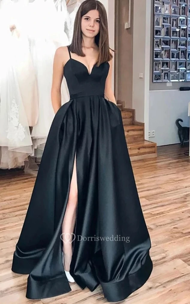 Satin Floor-length Sweep Train A Line Sleeveless Informal Evening Dress with Split Front