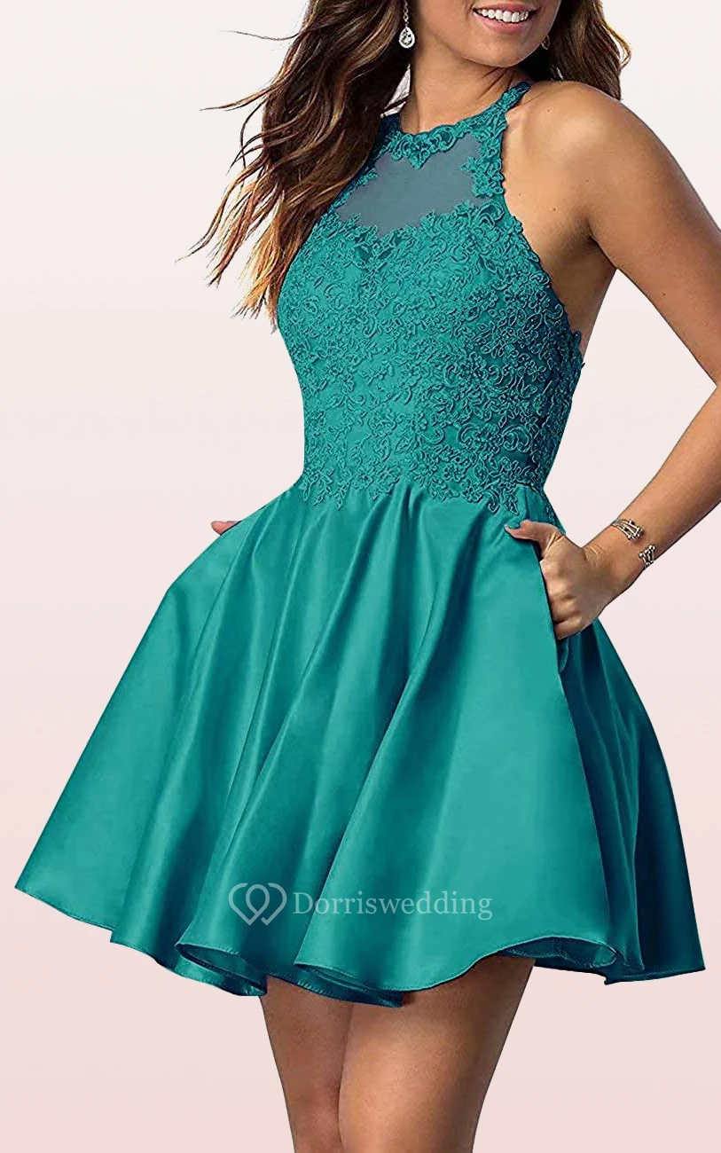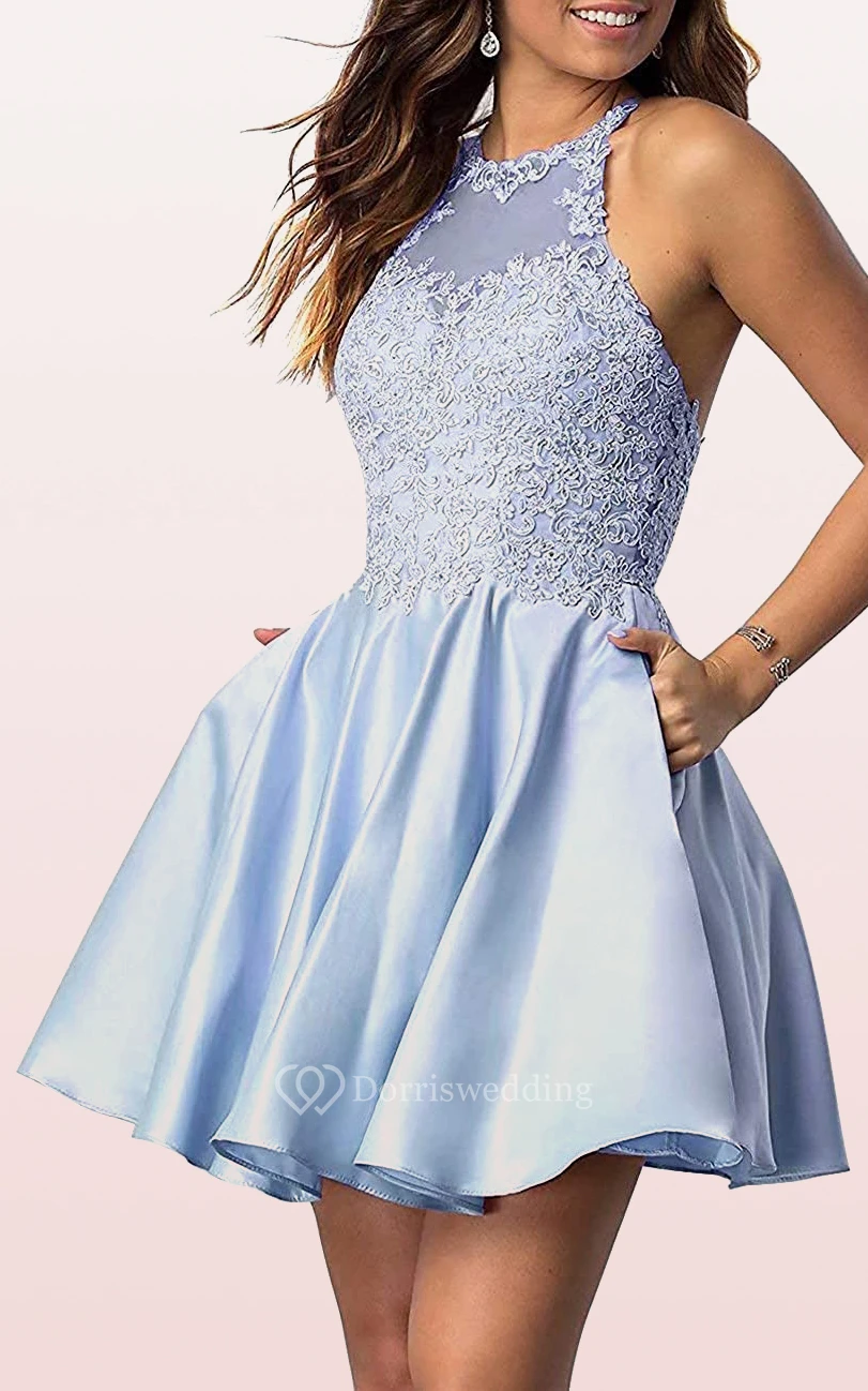 Satin Lace Mini A Line Sleeveless Adorable Homecoming Dress with Pleats