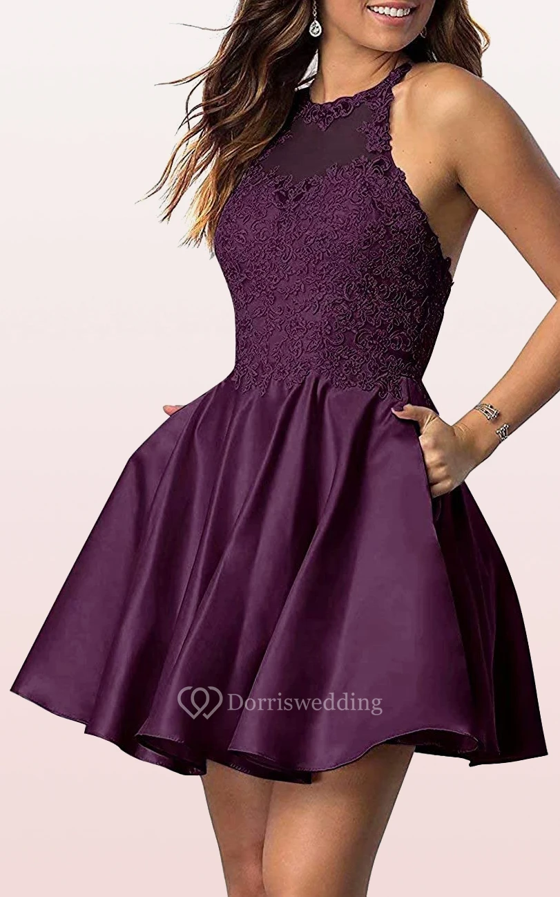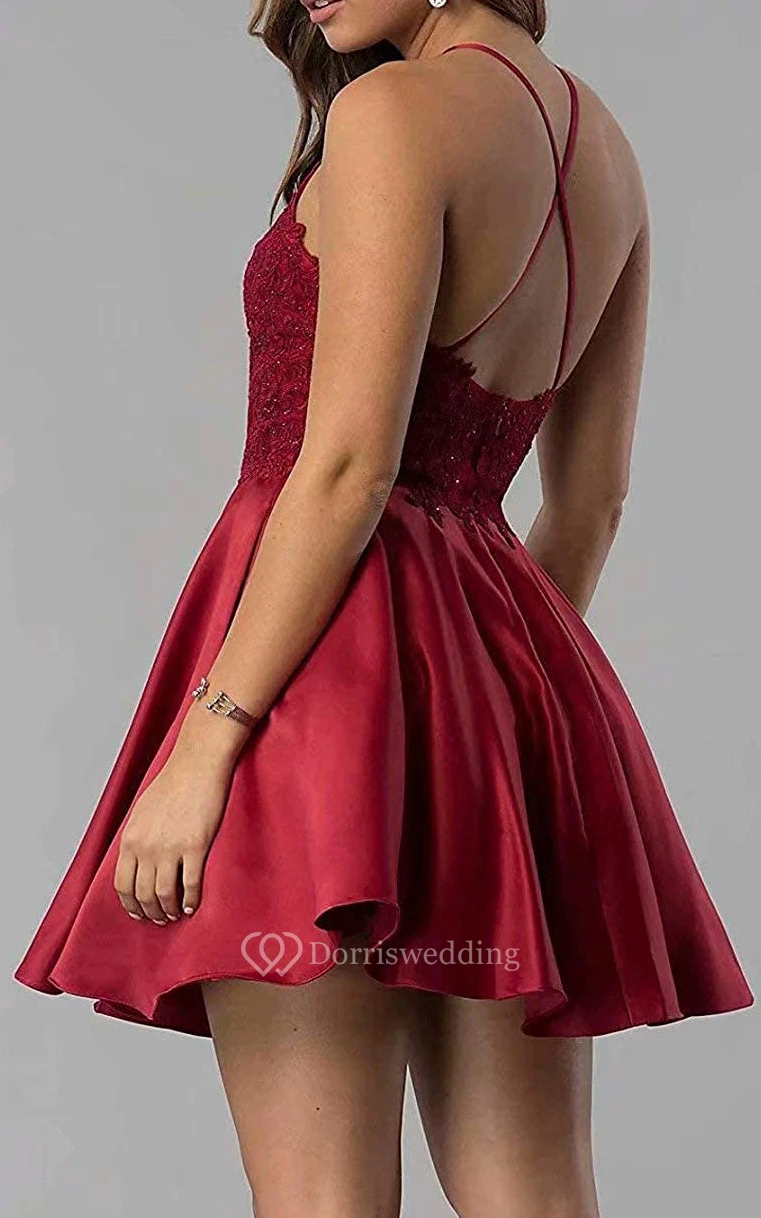 Satin Lace Mini A Line Sleeveless Simple Homecoming Dress with Appliques