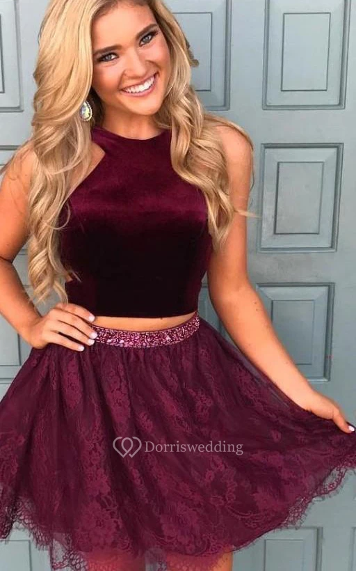 Satin Lace Short Two Piece Sleeveless Modern Homecoming Dress