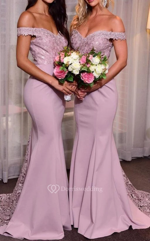 Satin Lace Sweep Train Mermaid Sleeveless Sexy Bridesmaid Dress with Appliques and Pleats
