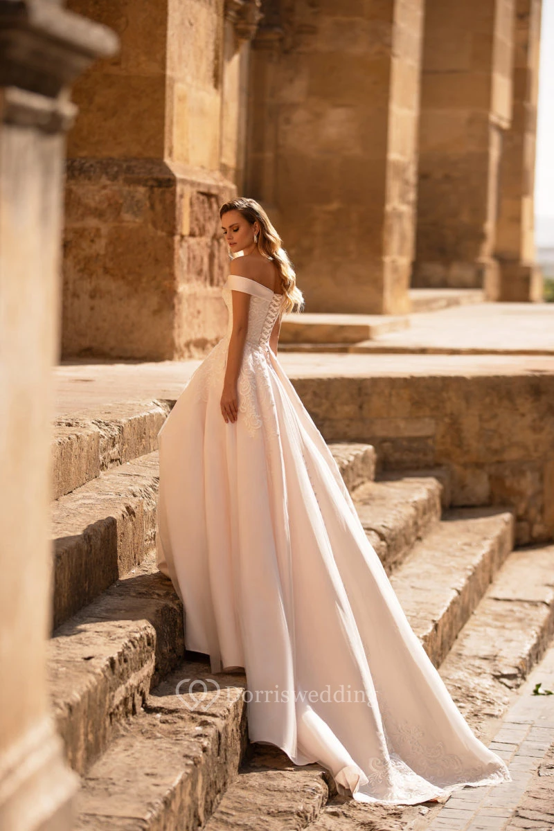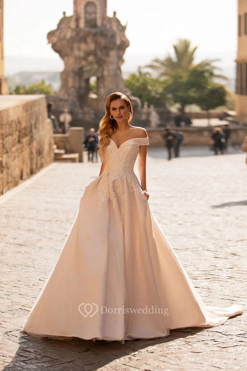 Satin Off-the-shoulder A-line Empire Lace Wedding Dress
