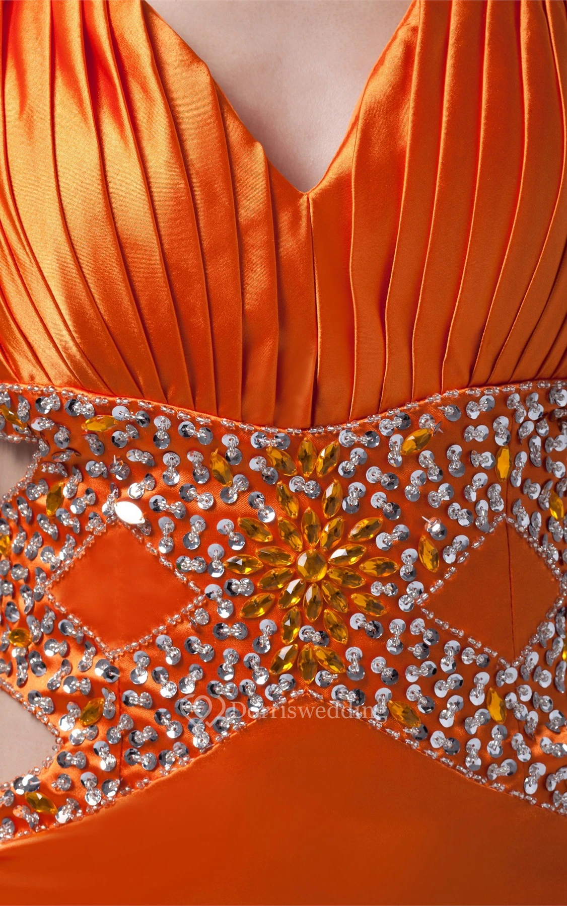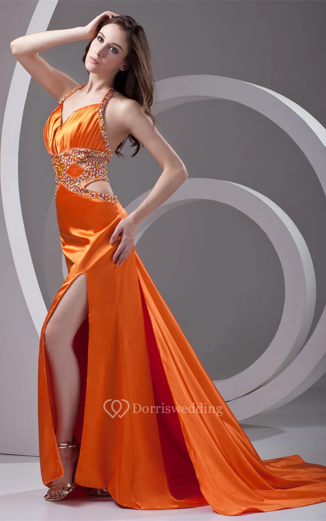 Satin Ruched Front-Split Halter and Dress With Rhinestone