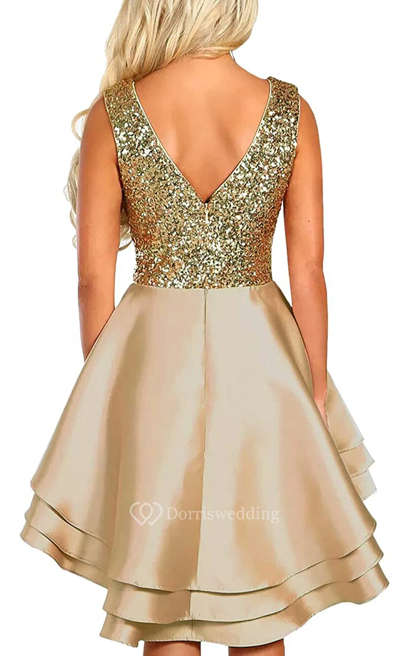 Satin Sequins High-Low Ball Gown Sleeveless Homecoming Dress with Ruffles