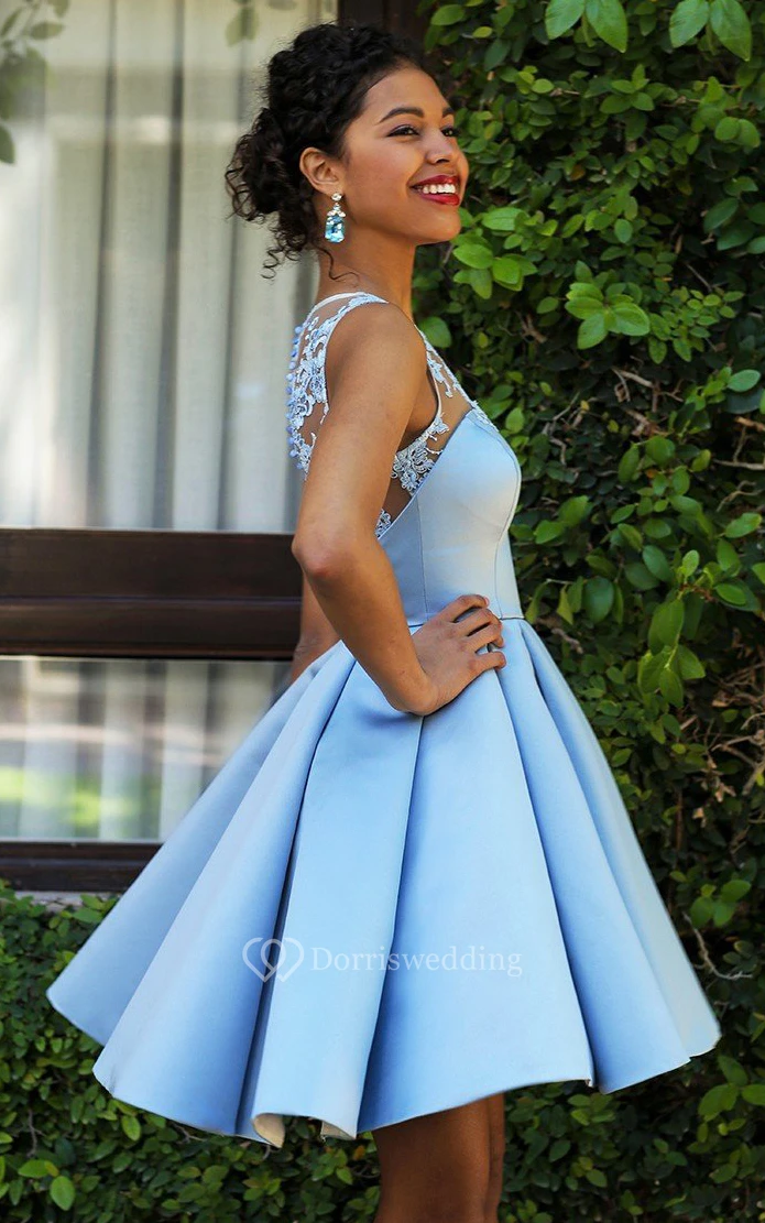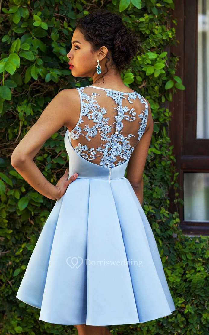 Satin Short A Line Sleeveless Sexy Homecoming Dress with Lace and Pleats