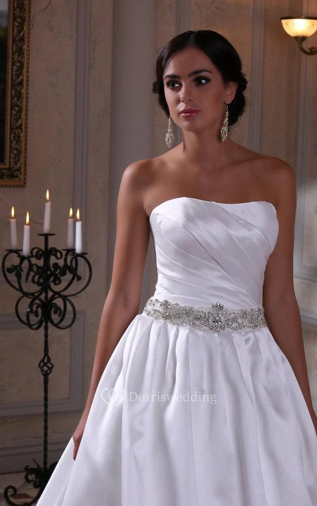 Satin Strapless Ball Gown With Ruching and Crystal Detailed Waistbelt