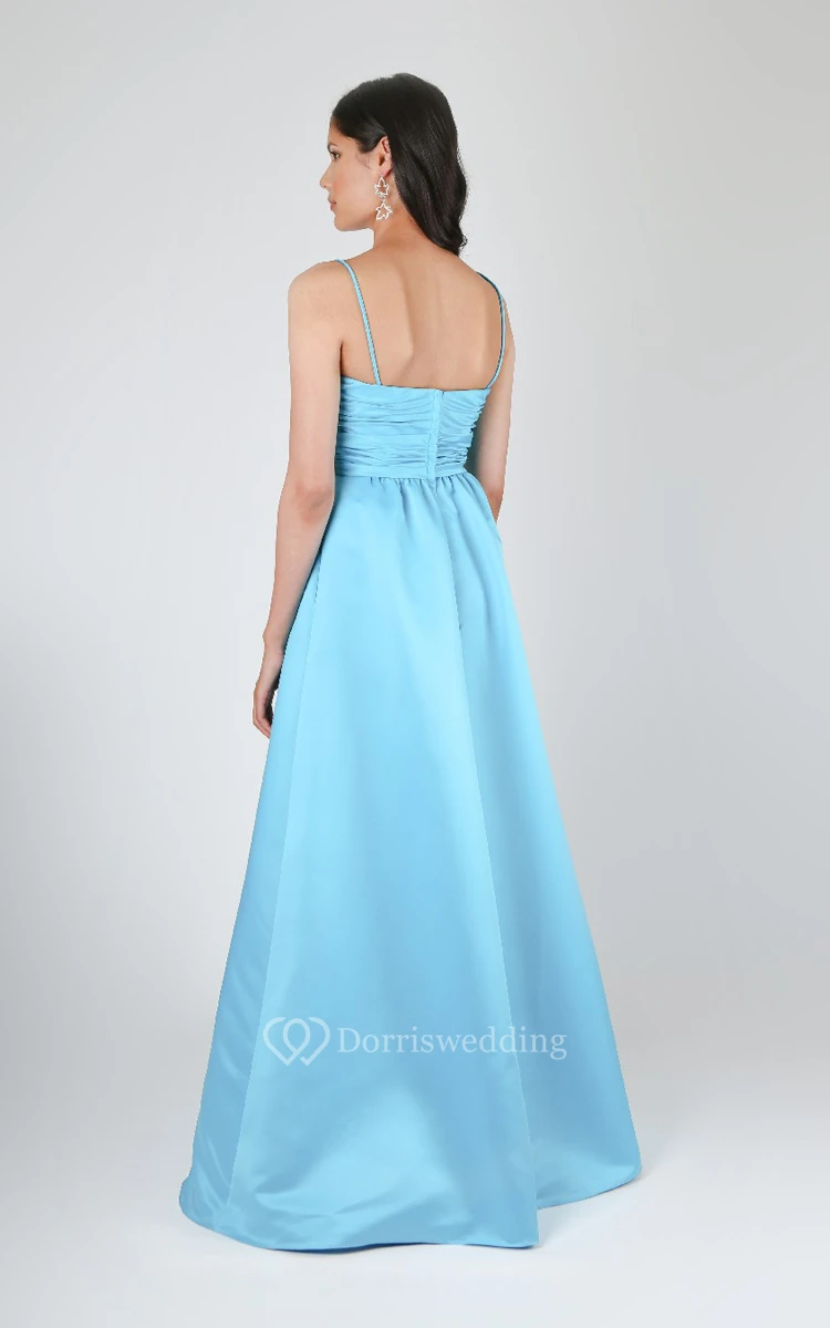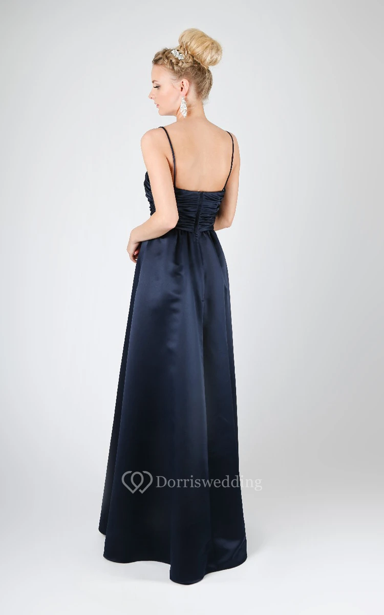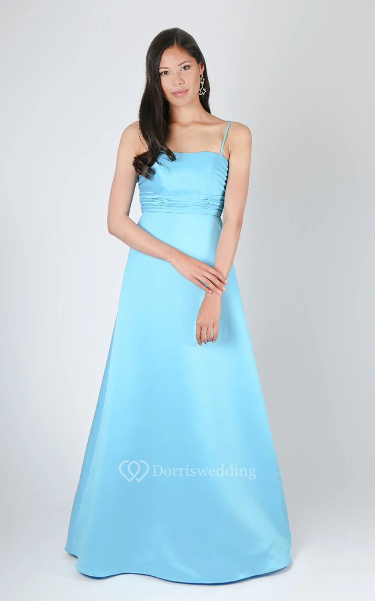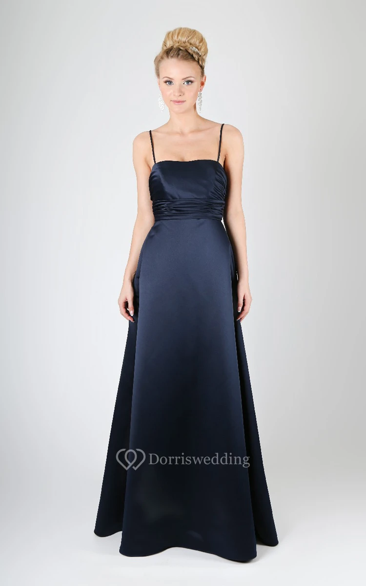Satin Straps Long A-Line Dress With Ruched Waist