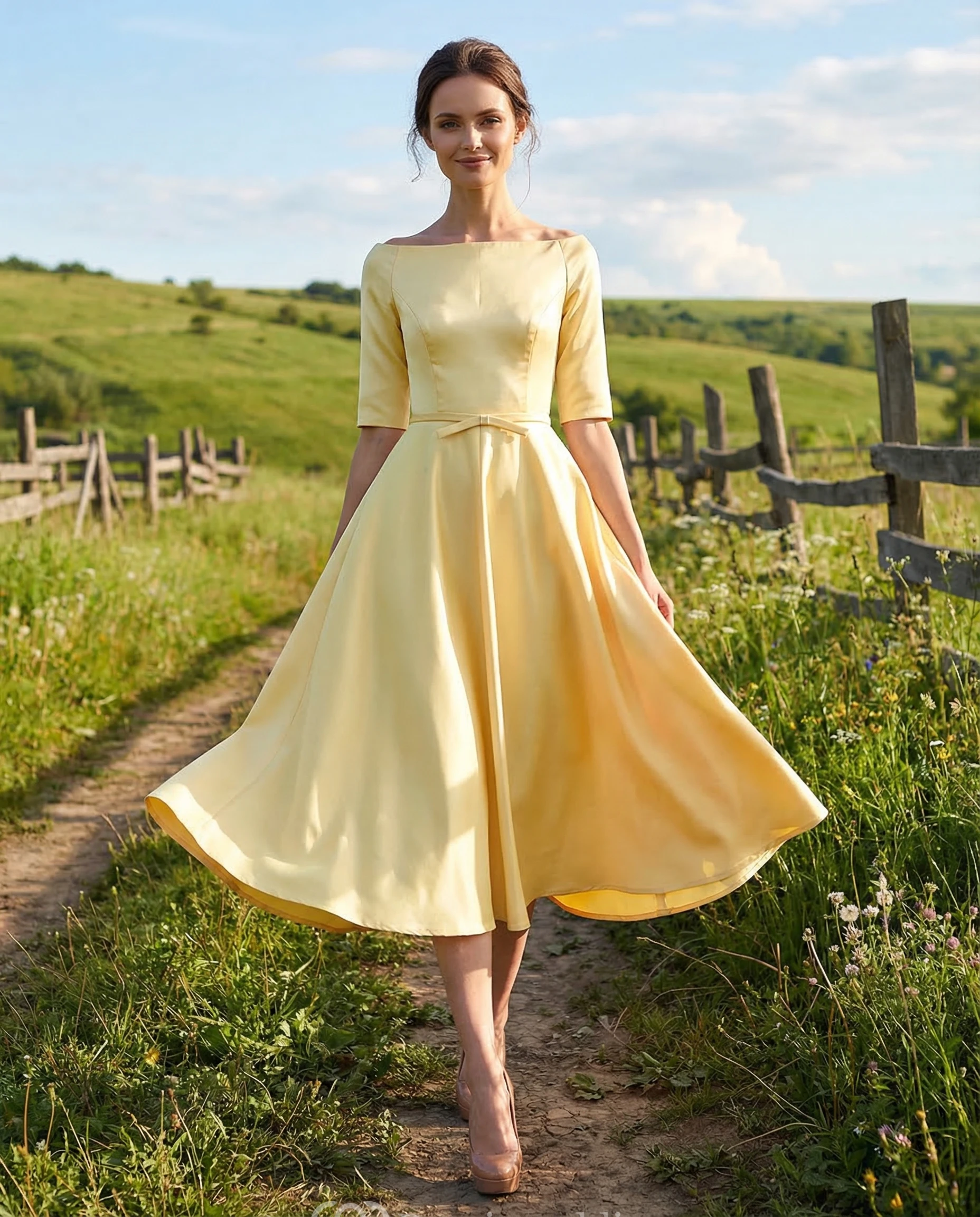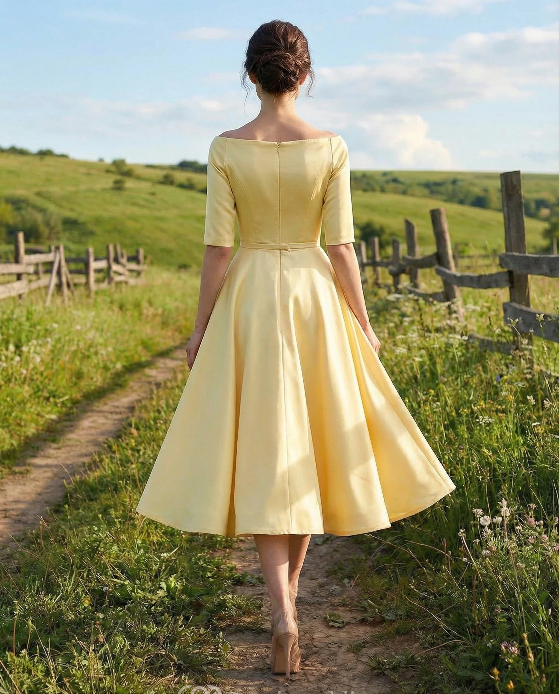 Satin Tea-Length Off-the-Shoulder Party Dress