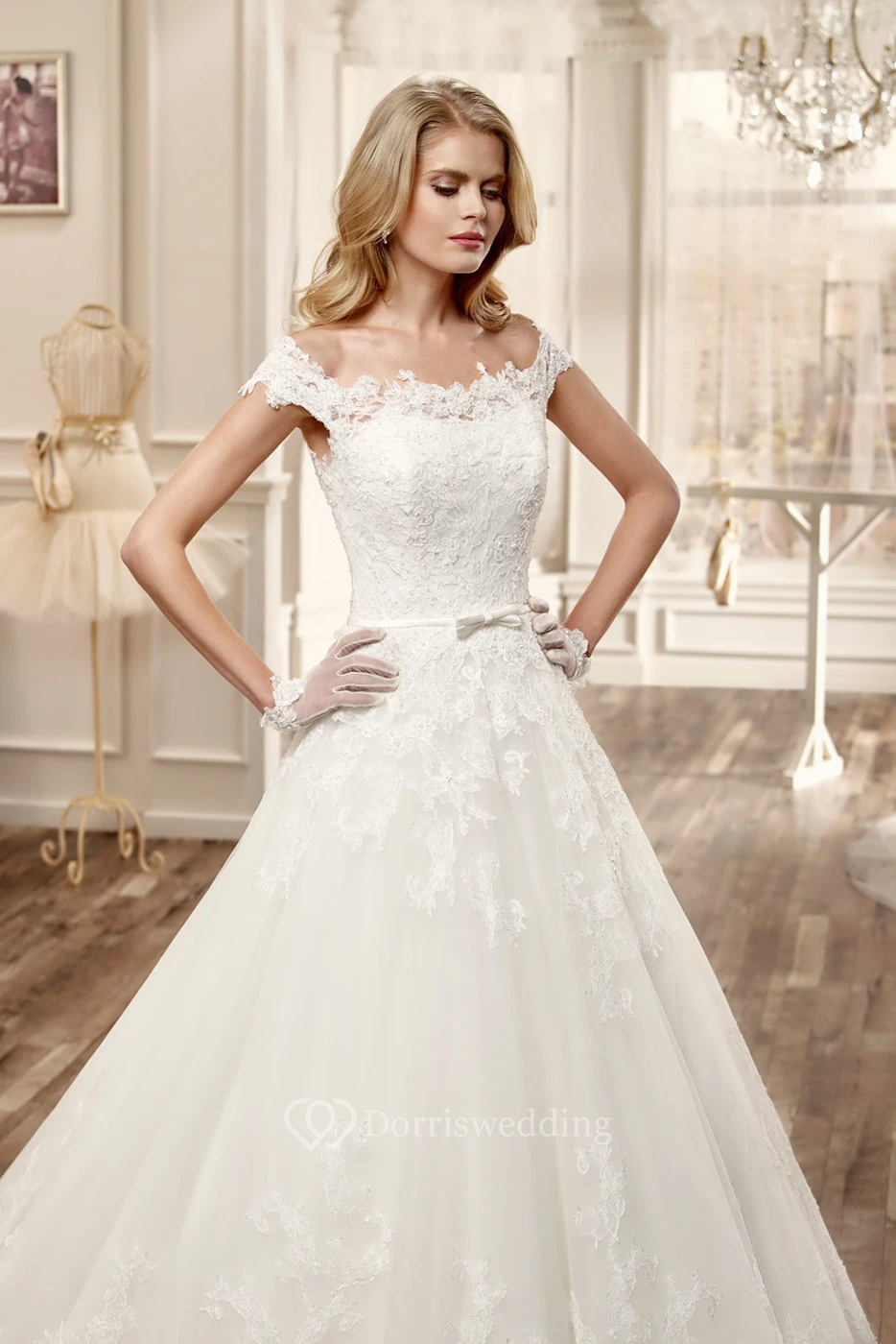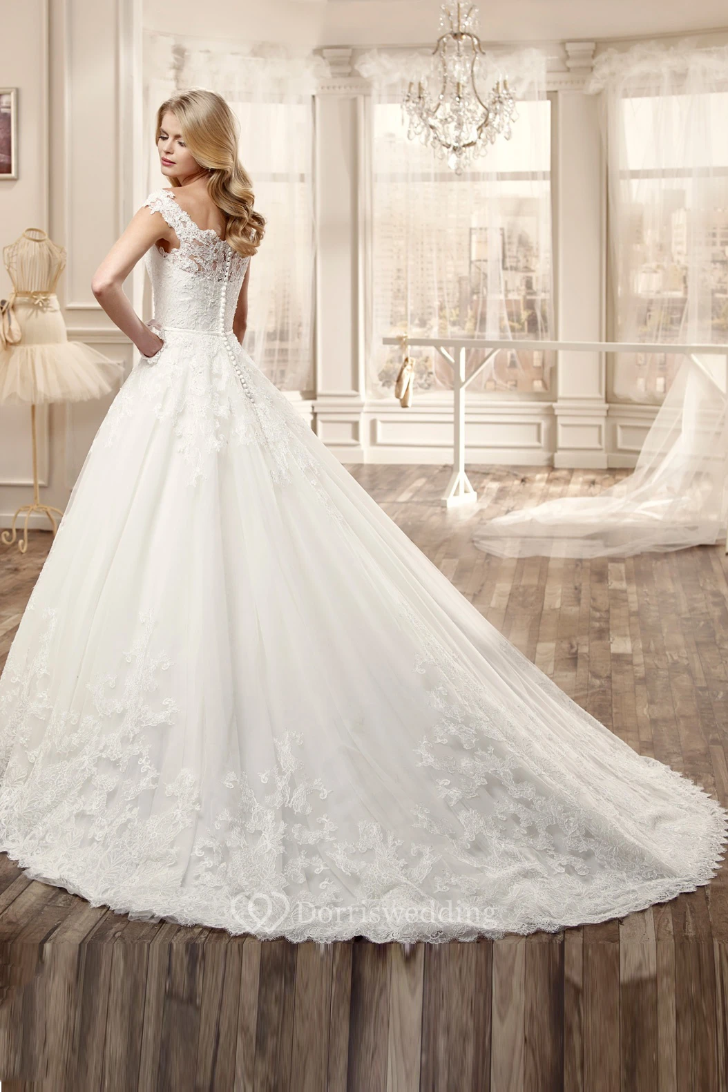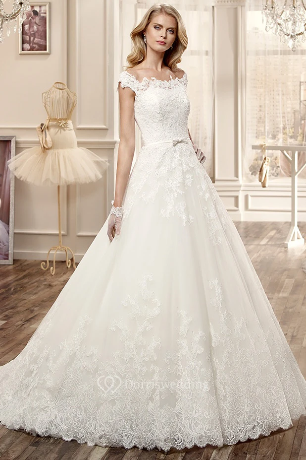 Scallop-Neck Long Wedding Dress With Court Train And Appliques