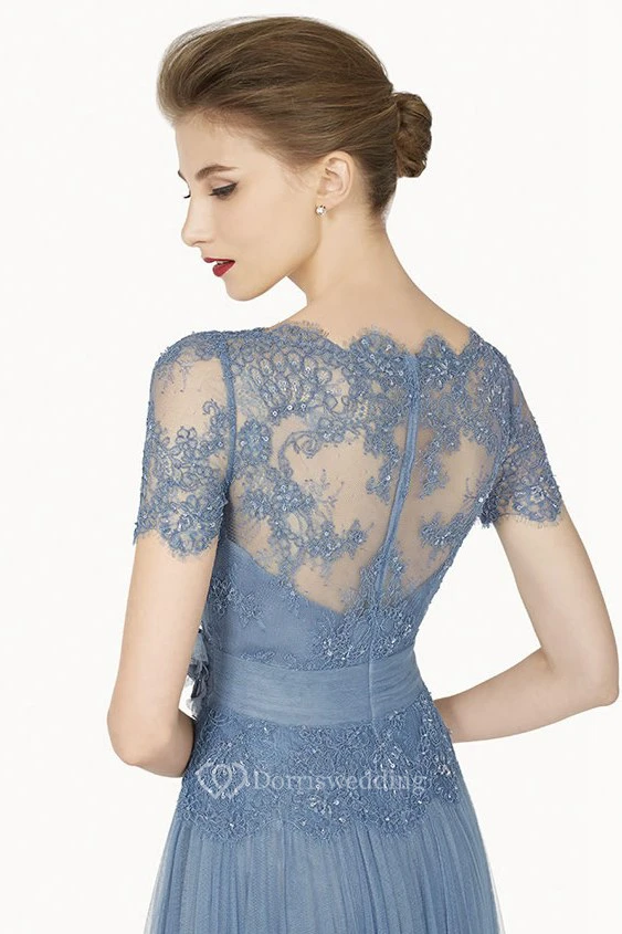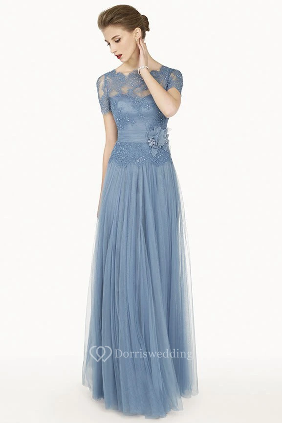 Scalloped Bateau Short Sleeve Lace Top Tulle Long Dress With Flower Sash