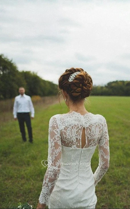 Scalloped Illusion Sleeve Keyhole Back Sheath Long Lace Wedding Dress