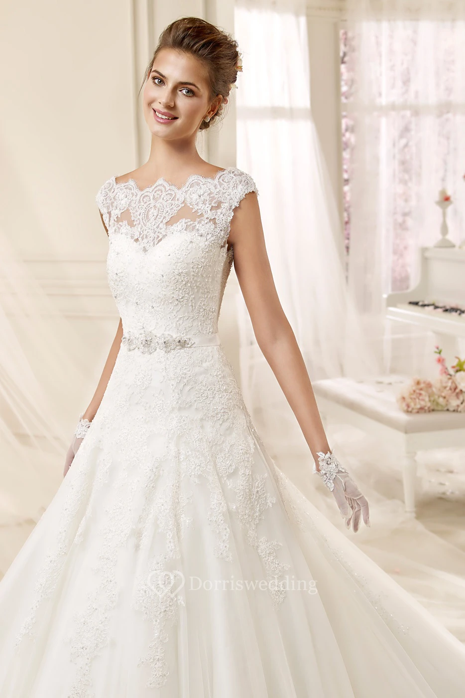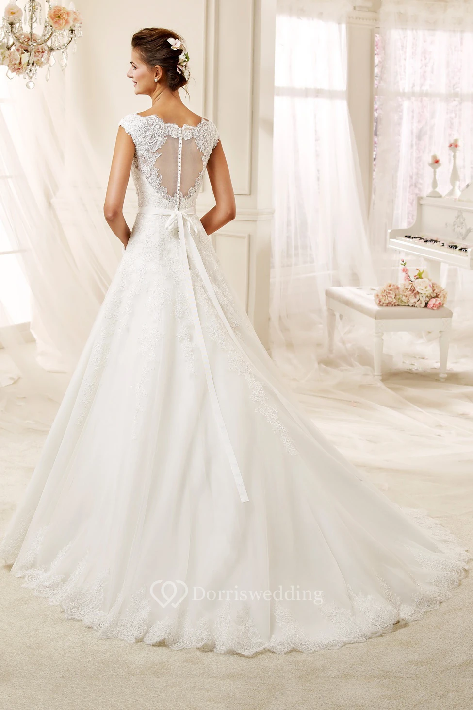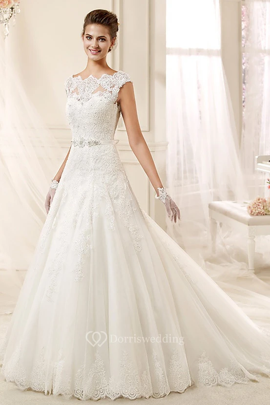 Scalloped-neck A-line Wedding Dress with Cap Sleeves and Appliques